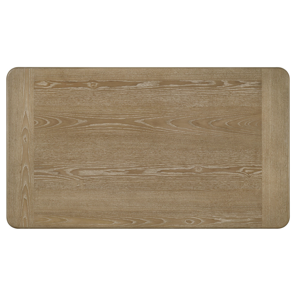 This sculptural coffee table set blends architectural rhythm with natural warmth through its curved pedestal bases and reeded detailing. The rectangular coffee table and square end table feature rounded corners and rich wood grain texture, finished in a distressed light brown tone that enhances their organic appeal. Crafted from engineered wood and ash veneer, this set brings lasting structure and visual harmony to both contemporary and transitional living spaces. Key Features: • Rectangular coffee table and square end table with softened, rounded corners • Distressed light brown finish emphasizes organic grain and tonal depth • Reeded curved pedestal bases add vertical rhythm and sculptural interest • Coffee table provides ample surface for decor, trays, or everyday items • End table adds compact function beside sofas, chairs, or in bedroom use • Engineered wood and ash veneer construction ensures visual and structural longevity