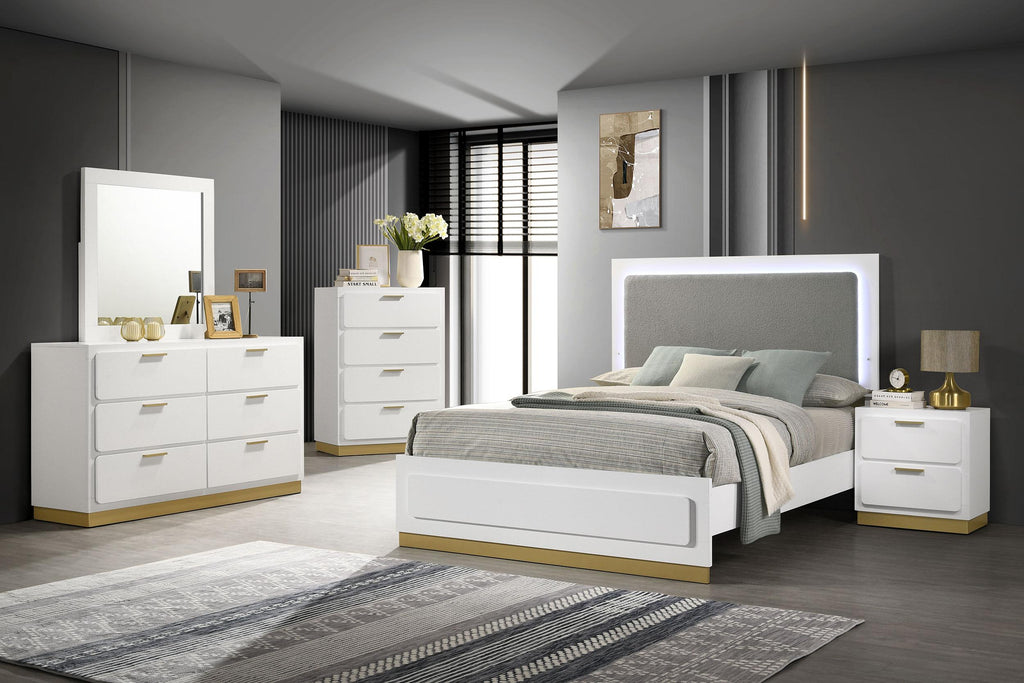 Build a modern bedroom oasis with the chic style and impressive simplicity of a contemporary bedroom set. The set offers abundant storage in various drawers, with a chic two-tone finish complete with bar drawer pulls and metallic kickplates that add dimension. The centerpiece of the set is a streamlined bed design complete with an upholstered headboard. Light gray fabric is lightly padded, offering impressive comfort for lounging. Built-in LED strip lighting surrounds the upholstered panel and is operated with a touch switch for easy, inviting ambiance and a low-profile footboard completes the look with, airy, modern appeal.
