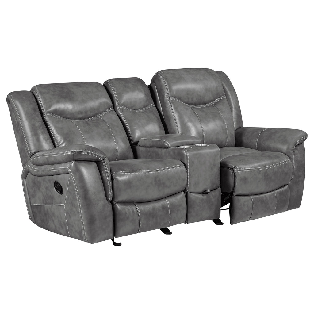 Experience superior comfort and modern convenience with this glider reclining loveseat upholstered in smooth grey faux leather. Designed with plush padded seats, headrests, and armrests, it offers a relaxing and supportive feel. The centre console includes two stainless steel cup holders, a soft-close lift-top compartment with dual AC and USB ports, and a lower storage drawer for added functionality. With a one-inch cool gel memory foam topper, this loveseat delivers lasting comfort and effortless style._x005F_x000D_ Key Features: • Manual glider reclining loveseat blends comfort and functionality • Smooth grey faux leather upholstery enhances modern appeal • Centre console includes dual stainless steel cup holders • Soft-close lift-top storage features two AC and two USB outlets • Hidden storage drawer keeps remotes and accessories organised • Cool gel memory foam topper ensures plush, lasting comfort