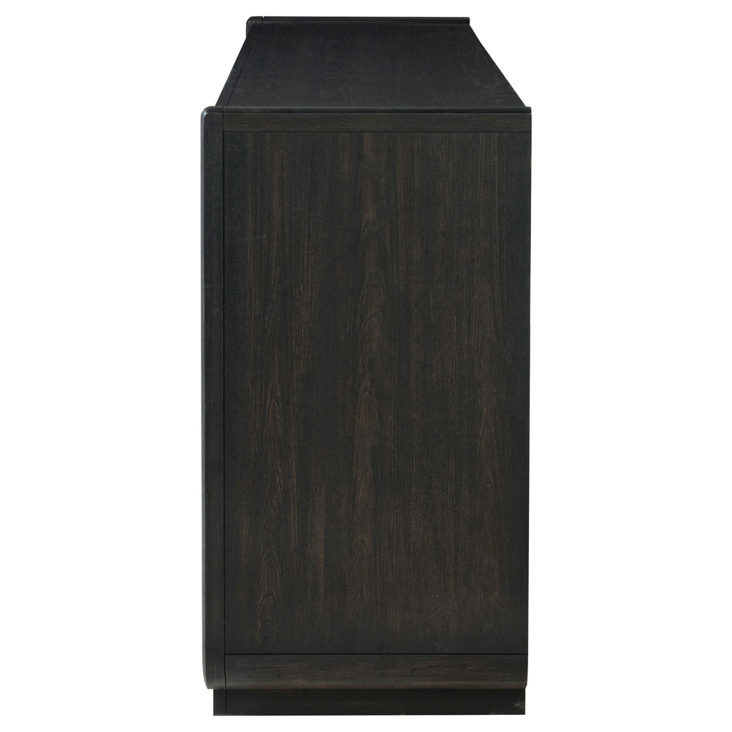 Defined by smooth curves and a rich burnished black finish, this eight-drawer dresser offers everyday functionality with refined simplicity. Its soft, rounded corners and minimalist drawer pulls speak to a modern sensibility, while black felt-lined top drawers cradle delicate pieces in quiet luxury. Soft-closing glides and dovetail joinery ensure lasting performance, while a dust panel base protects what’s tucked away. Crafted for balance and beauty, it’s both grounded and graceful. Key Features: • Eight-drawer dresser finished in burnished black for a bold, elegant bedroom foundation • Curved edge design and recessed pulls soften the overall silhouette • Top drawers lined in black felt to protect jewelry, watches, or accessories • Heavy-duty soft-closing ball bearing glides ensure smooth, quiet drawer use • English dovetail drawer construction adds strength and craftsmanship to design • Dust panel construction keeps contents clean and enclosed at the base