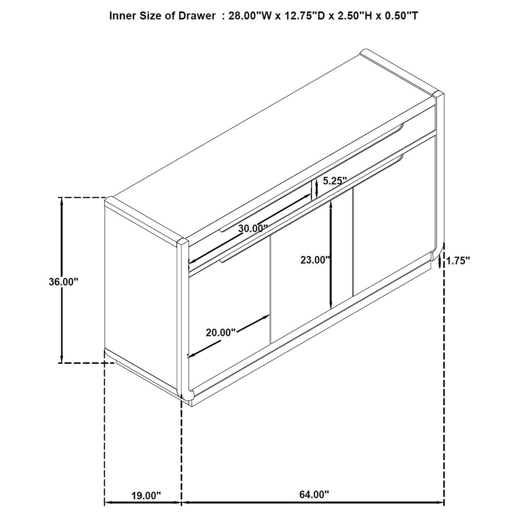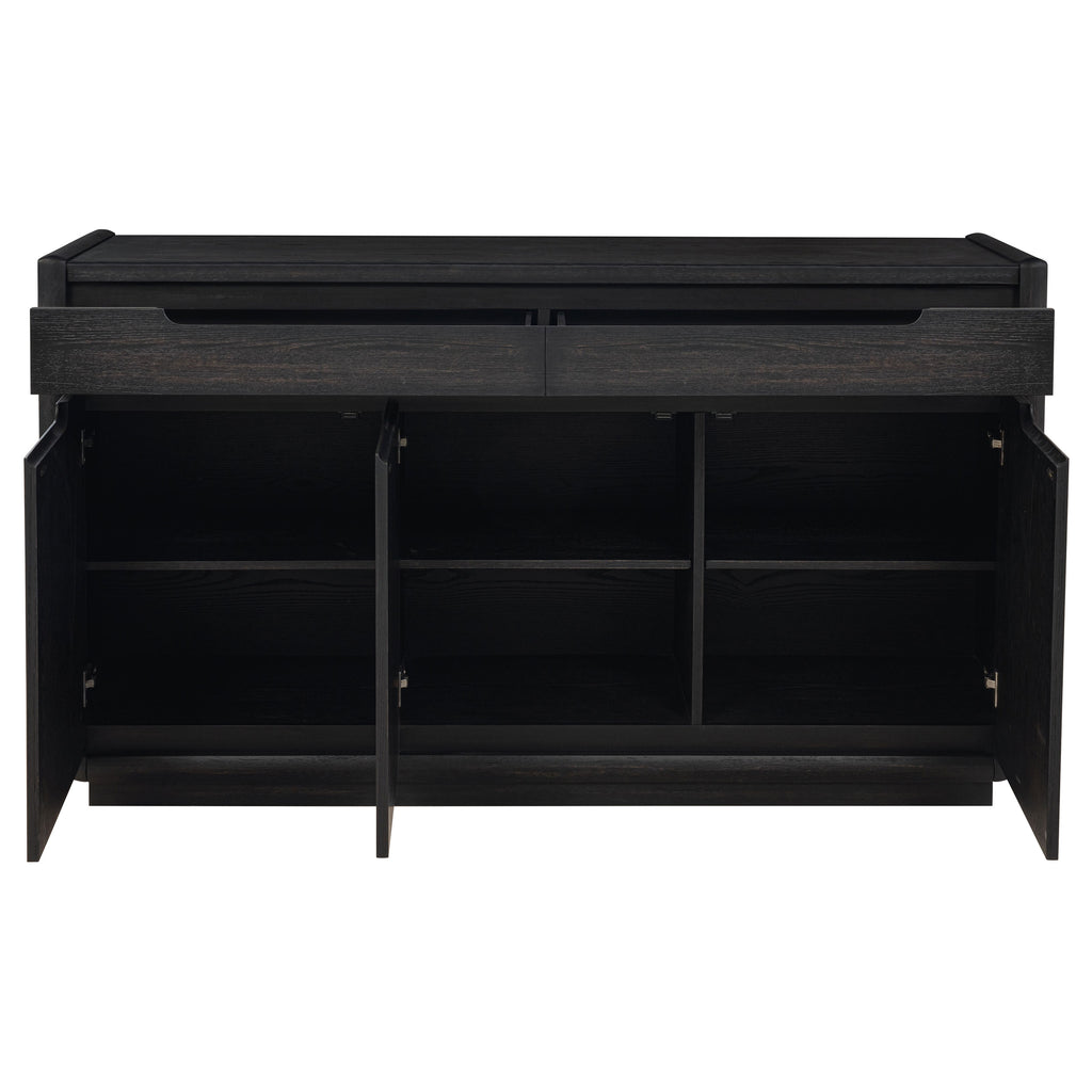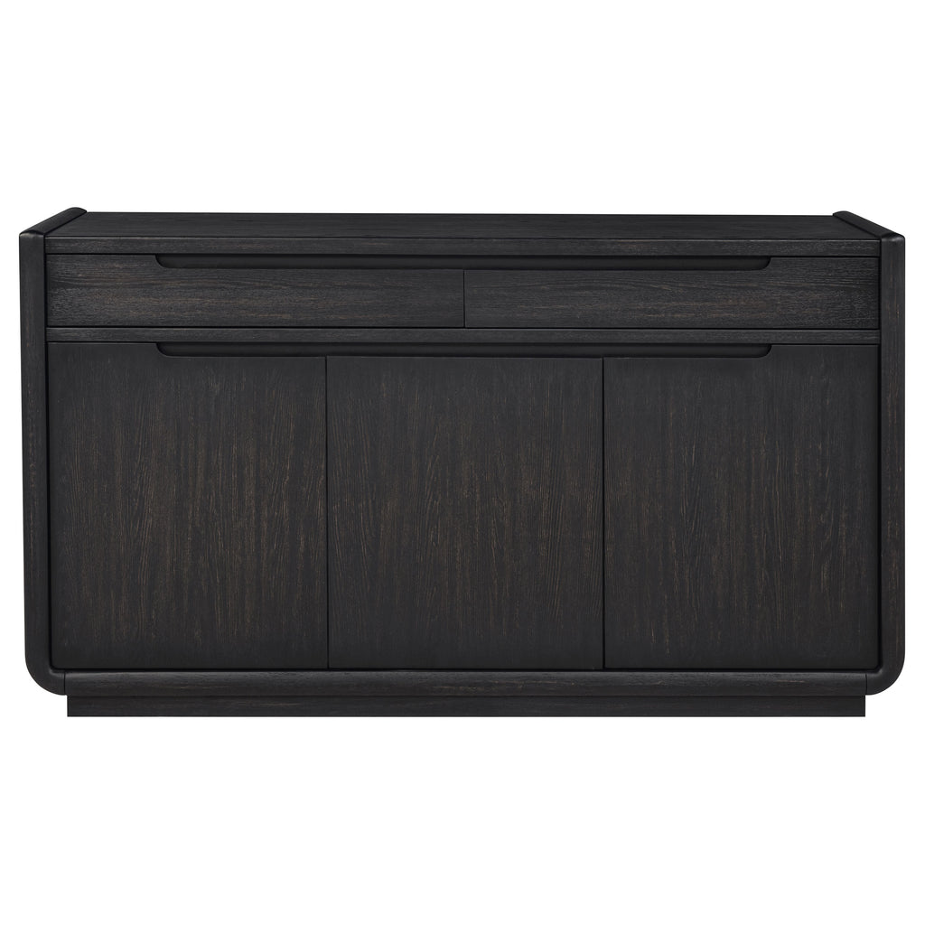 With a presence both grounded and graceful, this sideboard offers quiet beauty and purposeful design. Draped in a burnished black finish, its soft curves and minimalist lines open to thoughtful storage, two felt-lined drawers for treasured linens and flatware, and three softly closing doors revealing fixed shelves behind. Each detail, from the whisper-quiet glides to the dust panel below, is a study in balance, offering elegance that lingers long after the meal is done. Key Features: • Dining sideboard in burnished black with sculpted edges and clean, recessed pulls • Two felt-lined drawers with soft-closing ball bearing glides for refined storage • Three soft-close doors conceal fixed shelves ideal for serving pieces and dishware • Dust panel at the base ensures fully enclosed, protected storage space • Crafted from ash veneer, rubberwood, engineered wood, and plywood • Bold presence with understated lines designed for modern dining settings