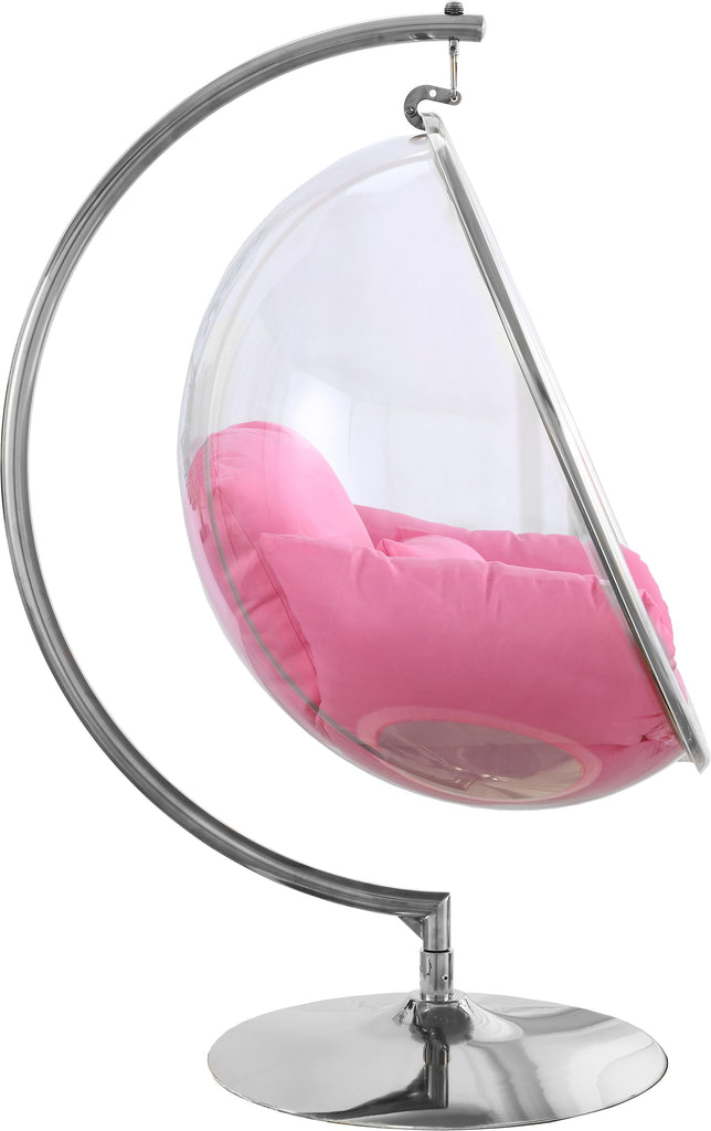 Retreat to your own little bubble, literally, in this Luna acrylic swing bubble accent chair. What a modish addition to your living room, bedroom or other space! This Luna chair features an acrylic egg-style seat topped with pink fabric-covered cushions for supreme comfort. The chrome metal base and frame provides sturdy support so that you can chillax to your hearts content in your very own sanctuary.