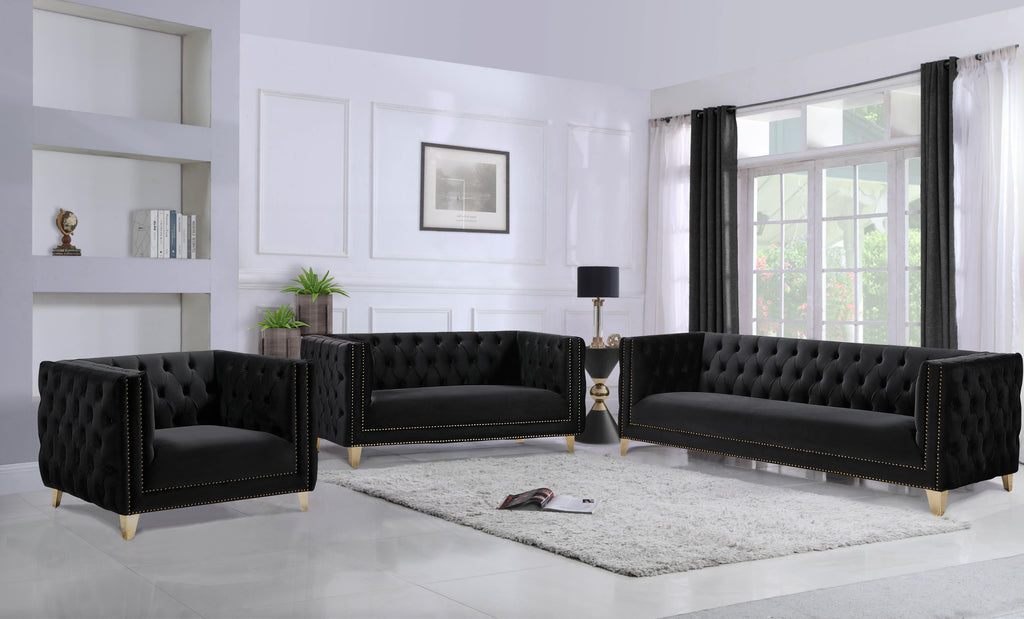 Upholstered in soft black velvet, this Michelle love seat is sumptuously glamorous. Designed for upscale living, this chair features rich gold nail head trim and gold iron legs that keep it grounded in contemporary beauty. Tufted material covers every inch of this unit, and button tufting ensures that the unit stays plump and comfortable and holds up well to continual use. Pair it with other items in the collection for a cohesive look.