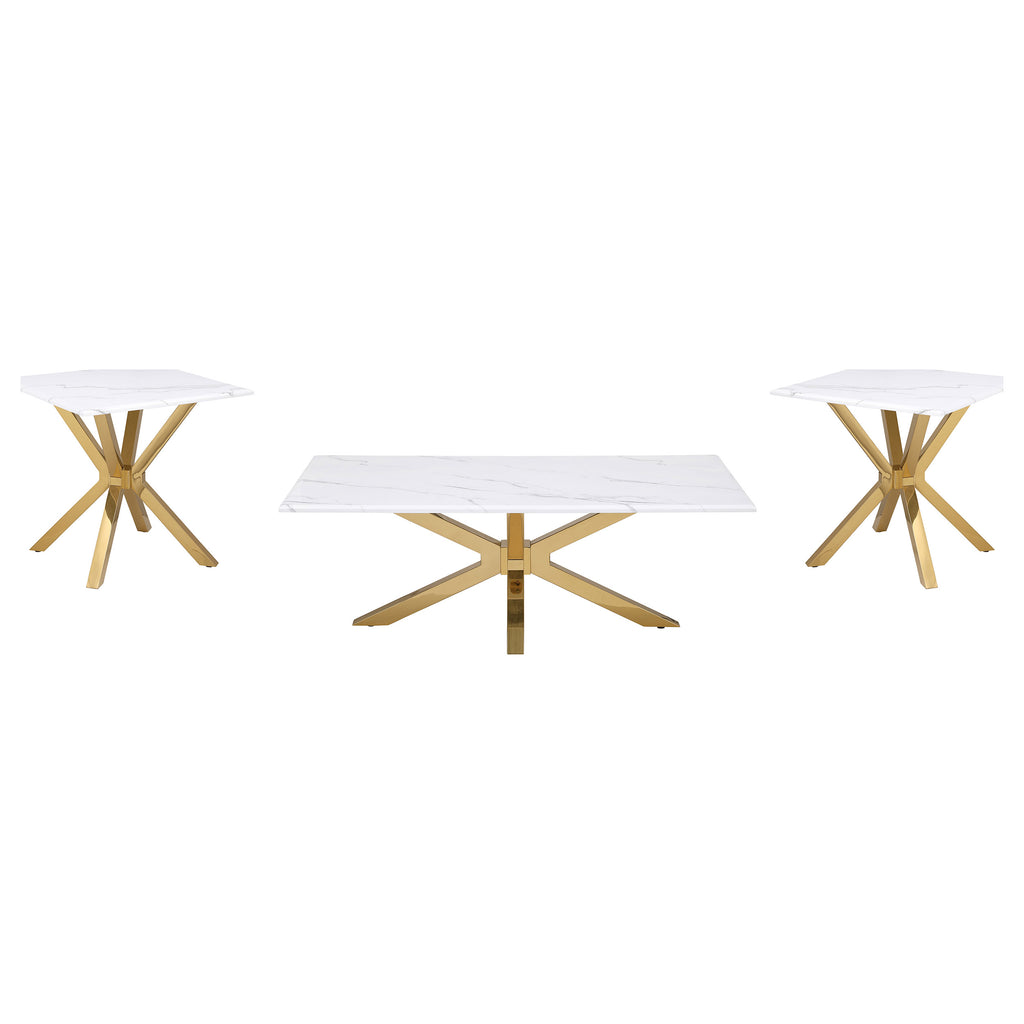 Upgrade your living room with this modern coffee table set, featuring a rectangular coffee table and a square end table. Each piece boasts a white faux marble top with realistic veining for timeless elegance. The star-shaped bases, crafted from durable stainless steel, are coated in a radiant gold finish using Particle Vapor Deposition (PVD), offering a blend of sculptural design and lasting durability. This set is the perfect combination of contemporary style and practical functionality for any modern space.