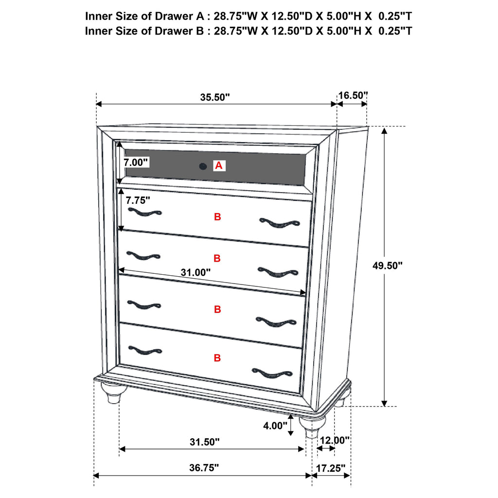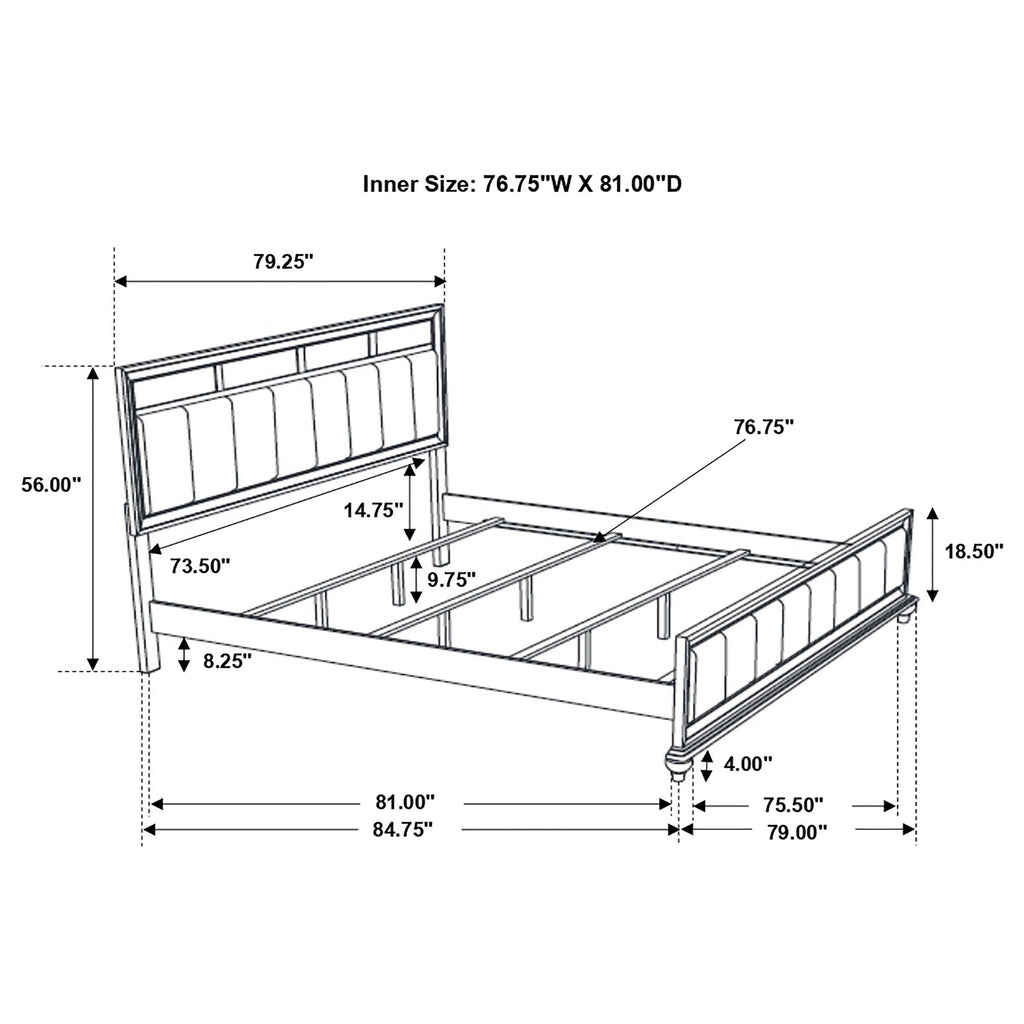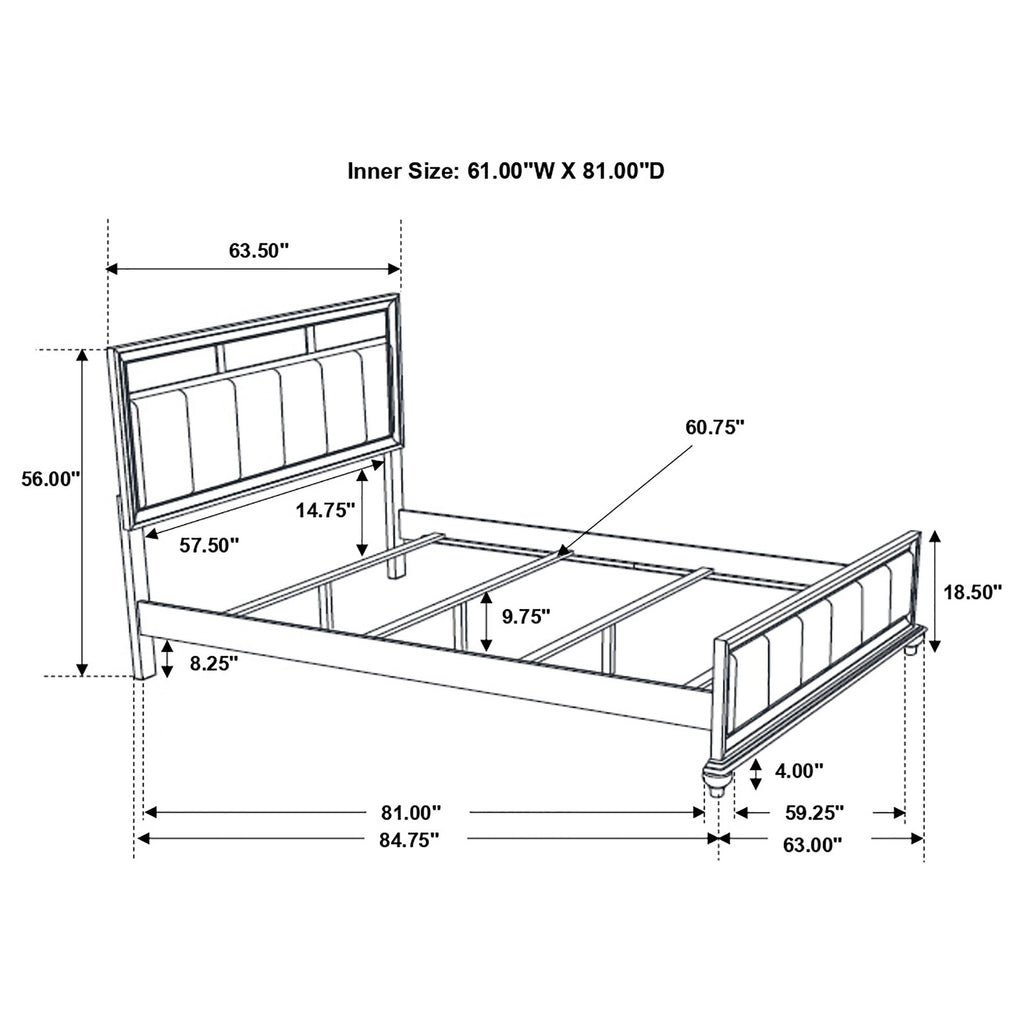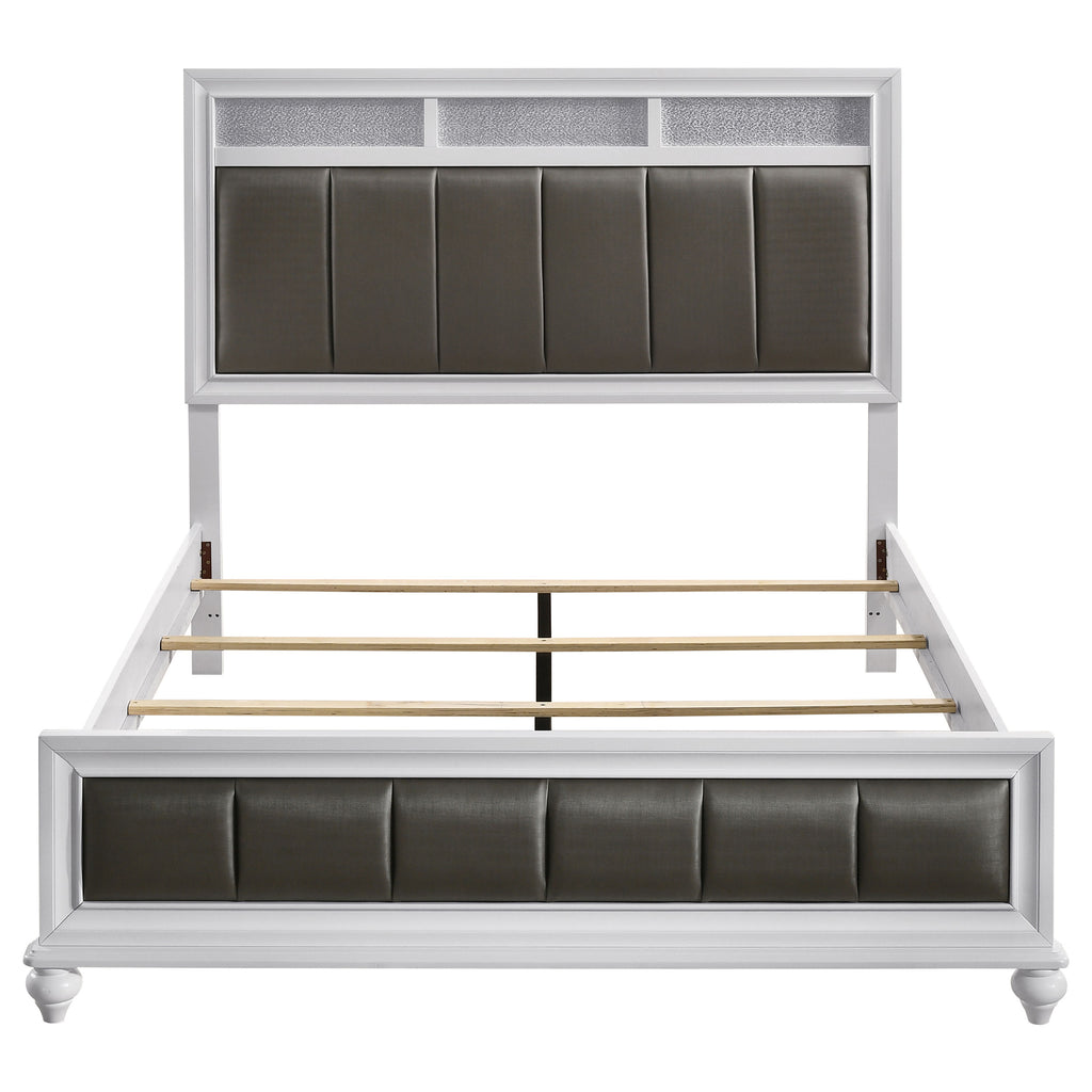 Exceptionally designed for transitional bedrooms, this five-piece bedroom set includes a panel bed frame, single two-drawer nightstand, five-drawer chest, and seven-drawer dresser with mirror, all in a crisp white finish with shiny metal hardware with faceted crystal accents. The paneled headboard and footboard offer channel tufted paneling wrapped in a metallic leatherette upholstery. Other extra touches include frame molding, turned feet, and felt lined top drawers. The nightstand offers a convenient power outlet for charging devices before bed. Place this bedroom set in a home to lend a more glamorous vibe.