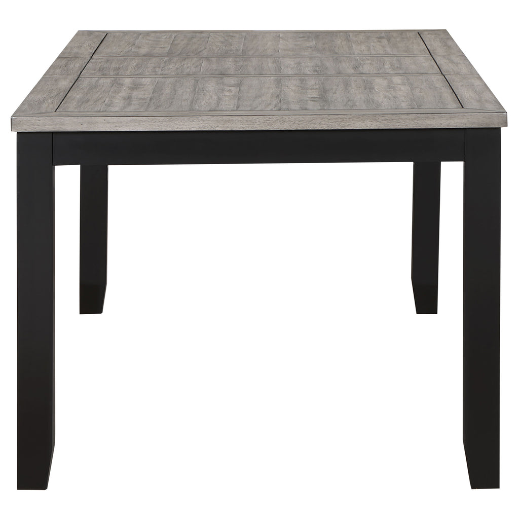 Elevate your dining experience with this farmhouse-inspired two-tone finished dining set. The table extends from 60" to 78" with an 18" extension leaf and features a wood on metal glide for smooth transitions. The side chairs, available in both regular and kitchen counter height, boast a grey and black two-tone design, with a plywood base and 100% polyester dove grey fabric for maximum comfort.