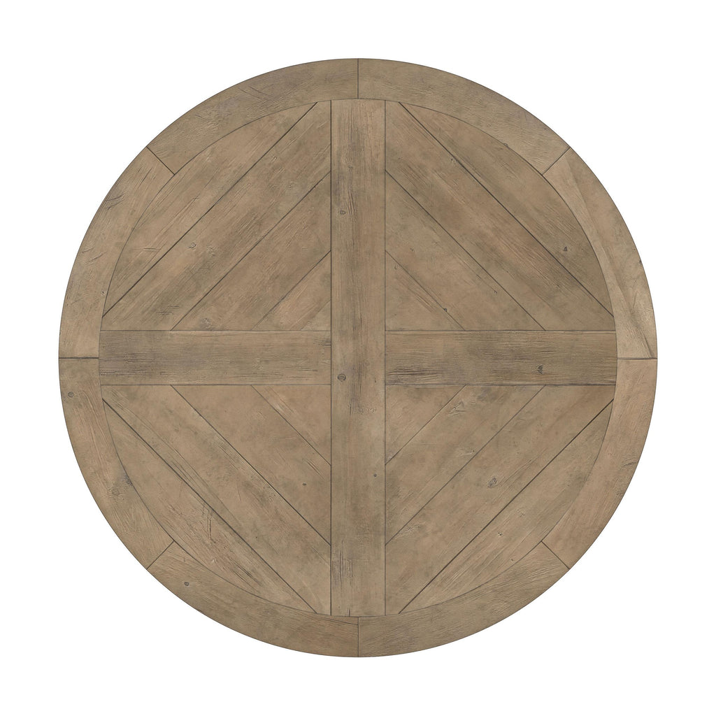 Create a warm and inviting space for family meals with a five-piece traditional dining set. It centers on a stylish wooden dining table with a round top. Its decorative pedestal and rustic smoke finish create a stylish look and feel, perfect for a refined home. The set includes four upholstered side chairs, each with a tall back for impeccable comfort and support. Oatmeal colored fabric upholstery is stylish but neutral enough to complement in any setting, while button tufting adds classic dimensionality.