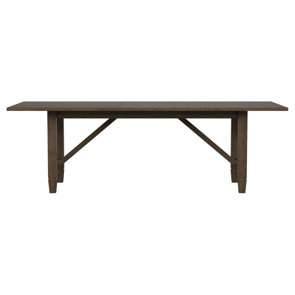 Create a soothing, relaxed ambiance in your welcoming dining room with a transitional five-piece dining set. The set centers on a rectangular table crafted in rubberwoods and graced with a warm, neutral brown finish. Angular support details add trestle-inspired style for a hint of farmhouse flair to the table, which includes an extension leaf for guests. Four side chairs are included, each boasting a matching wooden frame with a plush padded seat in neutral beige upholstery. Rectangular seat backs add rattan, bringing airy appeal and casual character in a kitchen or dining room. Key Features: • Clean lines and a mix of textures infuse character into a transitional five-piece dining set • Warm, natural brown wood grain finish pairs with a trestle-style table base • Charis features rattan backs in a light brown finish that creates warmth and engaging flair • Seats include plush foam padding and neutral beige upholstery fabric for a versatile look • Table includes an 18-inch extension leaf that's ideal for larger spaces, families, and entertaining