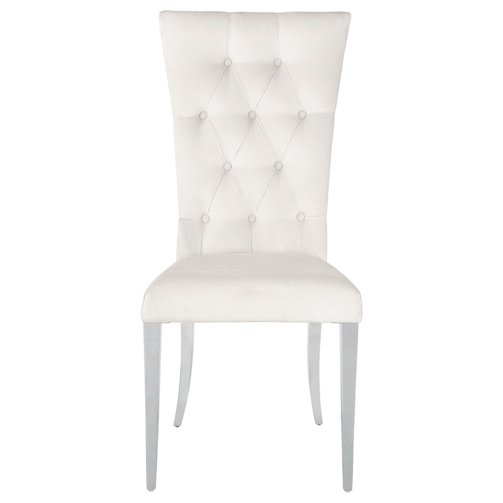 Host a party at this sophisticated modern glam dining table set, designed with a gorgeous polished chrome finish across its demilune pedestal base and four slender dining chair legs. The spacious rectangular table top presents a faux marble top and seats four comfortably and offers plenty of space for family and friends. Slide up in a Parson style dining chair, upholstered in a luxurious velvet fabric that offers a contemporary flair and soft look and feel. Button tufted backrests fan out toward the top, offering a modern expression to their classic silhouettes. Lastly, a beveled edge surrounds the table top, presenting a hint of intricate texture to the sleek aesthetic.