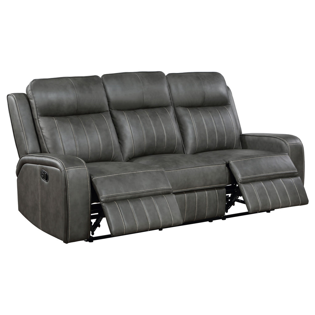 Merging the classic style of both contemporary and transitional design schemes, the three-piece sofa, loveseat, and recliner set create a dreamy venue for relaxing. The trending look of smooth grey leatherette upholstery with vertical topstitching delivers decorative elements and a dimensional impact. This motion-reclining set features foam padding on its frames and pocket coil spring seat cushions, as attached back cushions are capped with ultra-plump headrests. Recline into varying positions using a manual control function, and enjoy space efficiency with its wall-hugger design. Bonus features include a center-mounted loveseat console with a flip-top storage bin and a pair of handy beverage holders.