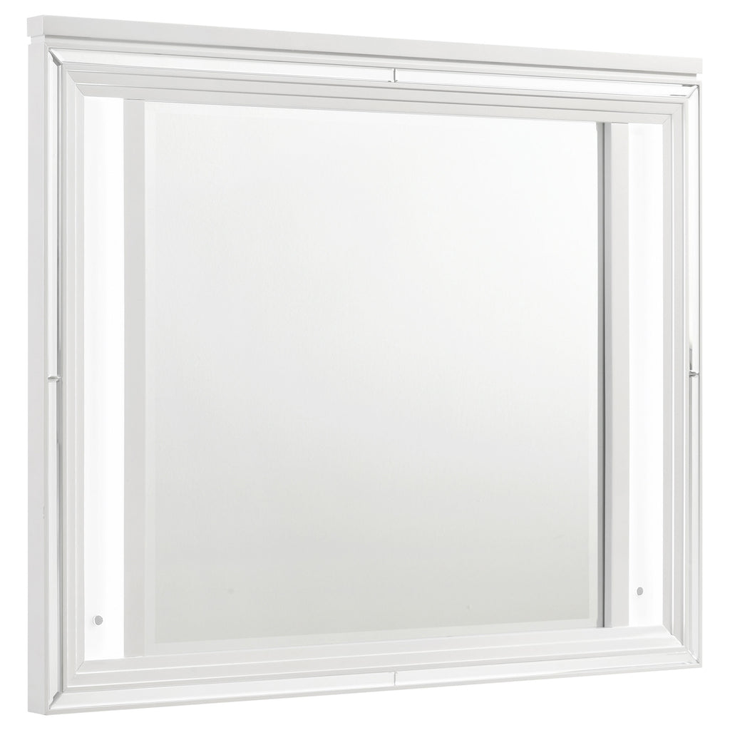 Create a cohesive and luxurious look in your bedroom with this bedroom set. Featuring a bed, nightstand, dresser, mirror, and optional chest, each piece is designed with a modern Italian aesthetic. The white finish, picture framed recessed panels, and embossed herringbone graphic patterns exude sophistication, while the mirror framing, acrylic legs, and polished chrome metal hardware add a touch of opulence. This set offers both style and functionality, making it the perfect choice for your elegant bedroom.