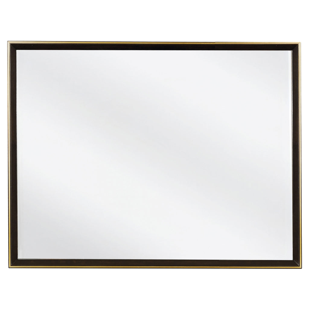 Create an interesting visual in a modern bedroom with the geometric features from this eastern king four-piece bedroom set. The high upholstered headboard adds depth and warmth with a smoked peppercorn finish. Versatile in style, this set is complete with a nine-drawer dresser and two-dresser nightstand and included shelf. Bring structure and personality to a room with the retro inspired details. Clean and elongated, the mirror looks great above the tall dresser.
