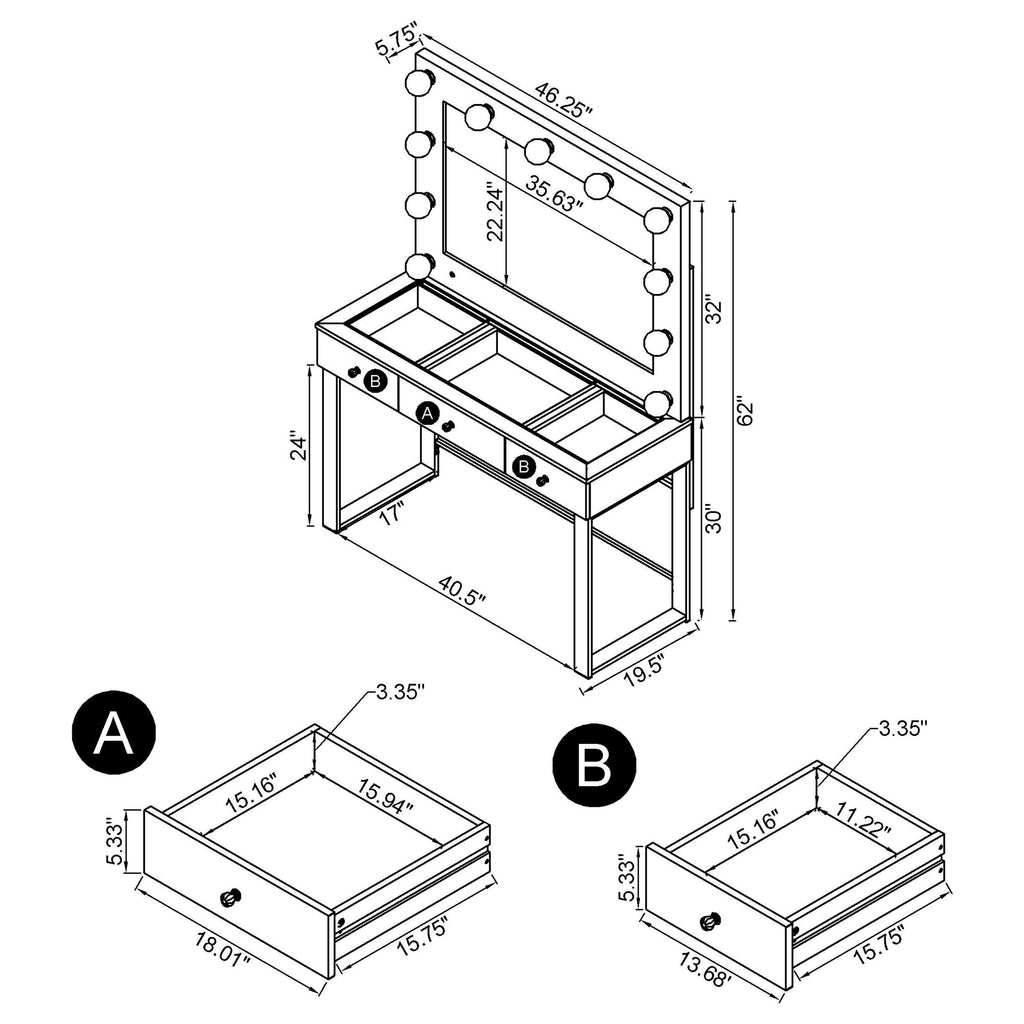 With a Hollywood regency flair, this modern vanity set features a stunning mirror paneled design that reflects surrounding hues. Cleverly designed with a clear tempered glass top that showcases cosmetics and accessories tucked inside the three drawers beneath, this vanity offers a unique functionality. Adorned on each of the three bright white drawers are crystal-like acrylic pulls, further lending to its dramatic glam flair. Mounted on the back is an oversized mirror framed in a mirror-like polished chrome metal finish, complete with a series of retro-inspired, Edison-style LED bulbs. Constructed with a heavy gauge steel base, this vanity set is made to last. Key Features: • Infuse a touch of Hollywood glam with the grand presence of this stunning vanity • Vanity table features a clear tempered glass top and three drawers allowing you to showcase your accessories • Mirror features eleven light sockets for a superior all-around even lighting (light bulbs included) • Metal wrapped mirror frame, drawer fronts, and heavy gauge steel base electroplated and polished in chrome • Constructed with steel, MDF, particle board, glass, and engineered laminate