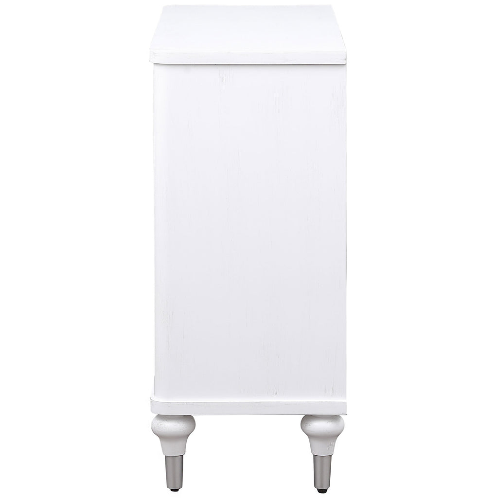 Put the last touches on a stylish space with the added storage and impeccable style of a modern accent cabinet. Featuring two decorative magnetic push-to-open doors, it's the perfect addition in any space, offering ample interior space with an adjustable shelf. The top creates space for decor or to highlight beautiful artwork hung above. The cabinet boasts a crisp white finish, bringing light, refined character to a pair of floral medallion doors. Curvy legs feature silver-toned caps, adding a hint of contrast and dimensionality in any room. Key Features: • Bold medallion doors highlight a modern two-door accent cabinet with stylish allure • Cool white finish is bright and airy, perfect for an entry, living area, or bedroom • Magnetic push-to-open doors feature carved floral medallions that bridge the gap between traditional and contemporary • Offers easy, stylish storage with an adjustable interior shelf that's great for any room • Curvy turned legs feature metal ferrules that add a touch of gleaming appeal