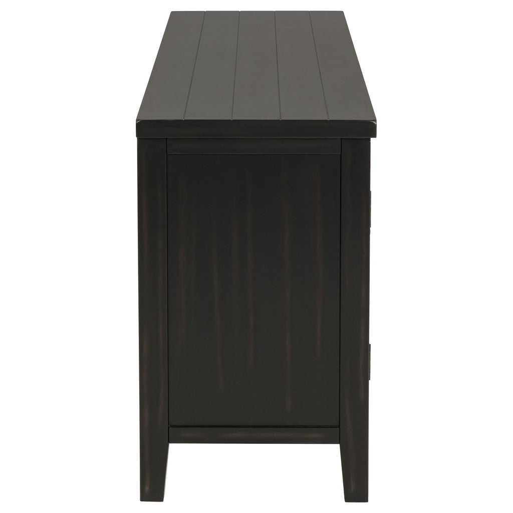 Upgrade your entertainment space with this stylish 60-inch TV stand, designed to accommodate TVs up to 65 inches. With two louvered doors, it combines classic charm with modern functionality, offering concealed storage for media equipment and accessories. The central open shelving provides easy access to devices, while cord management cutouts behind each compartment ensure a neat and organized setup. The rich wood finish, combined with a planked top, adds a touch of rustic sophistication to any room. Perfect as a TV stand, storage cabinet, or buffet, this versatile piece balances style and practicality in equal measure.