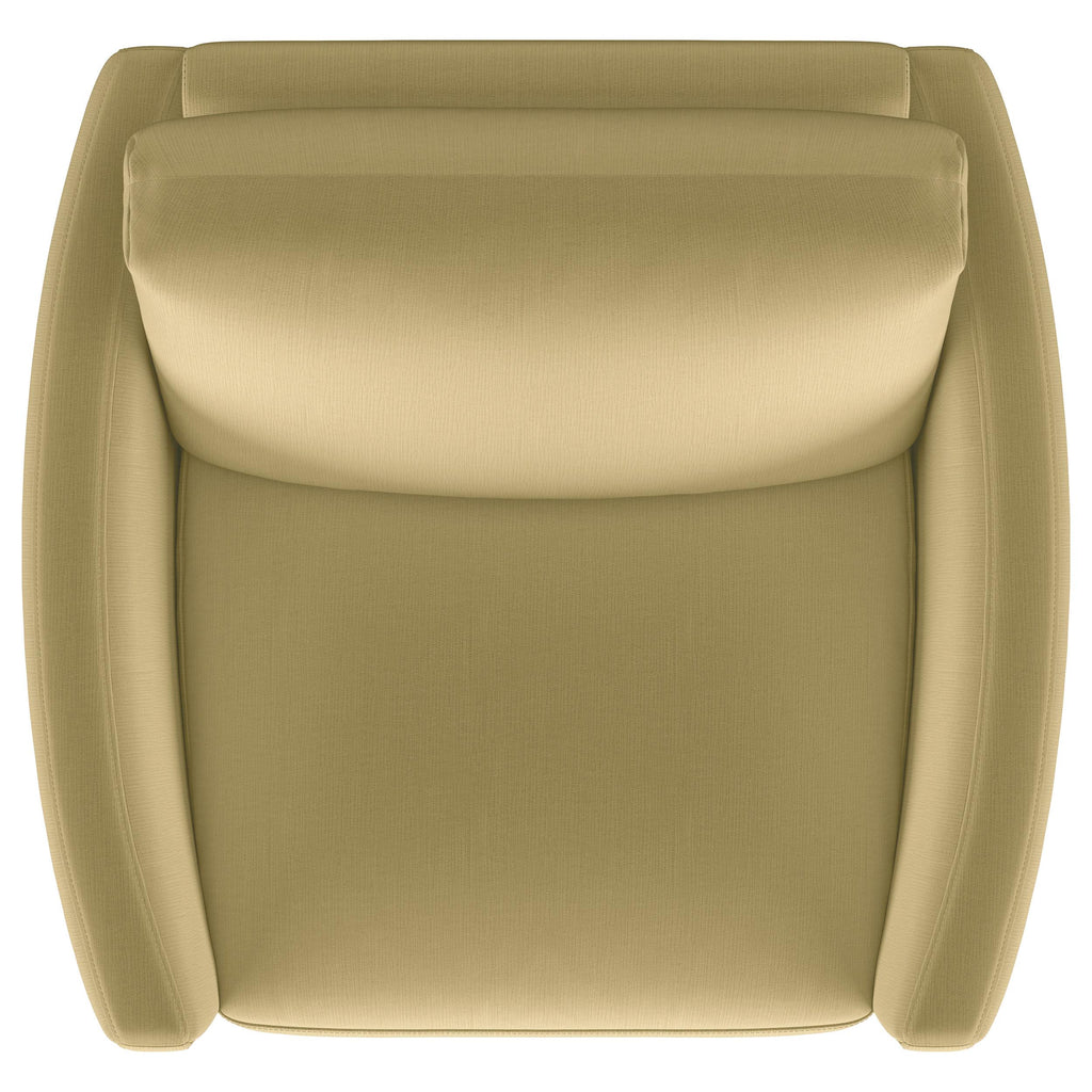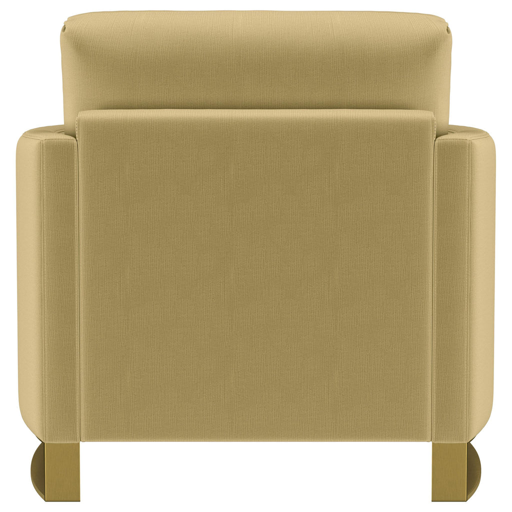 Indulge in opulent comfort with this textured velvet chair. Its reversible feather blend seat and back cushions, complemented by curved arms and gold stainless steel legs. Smooth upholstery and lustrous details blend simplicity with timeless splendor, making this piece a perfect focal point for refined interiors. With its inviting profile and graceful presence, it elevates both style and relaxation.