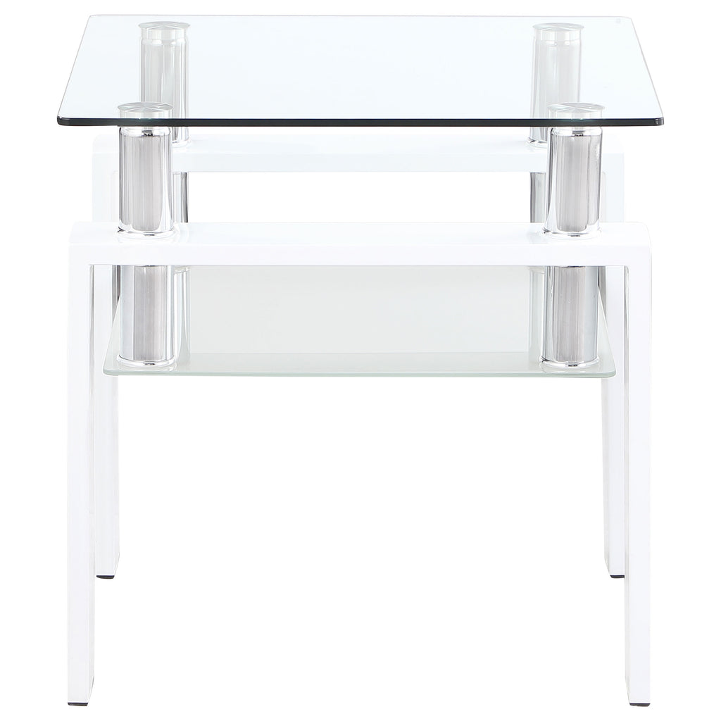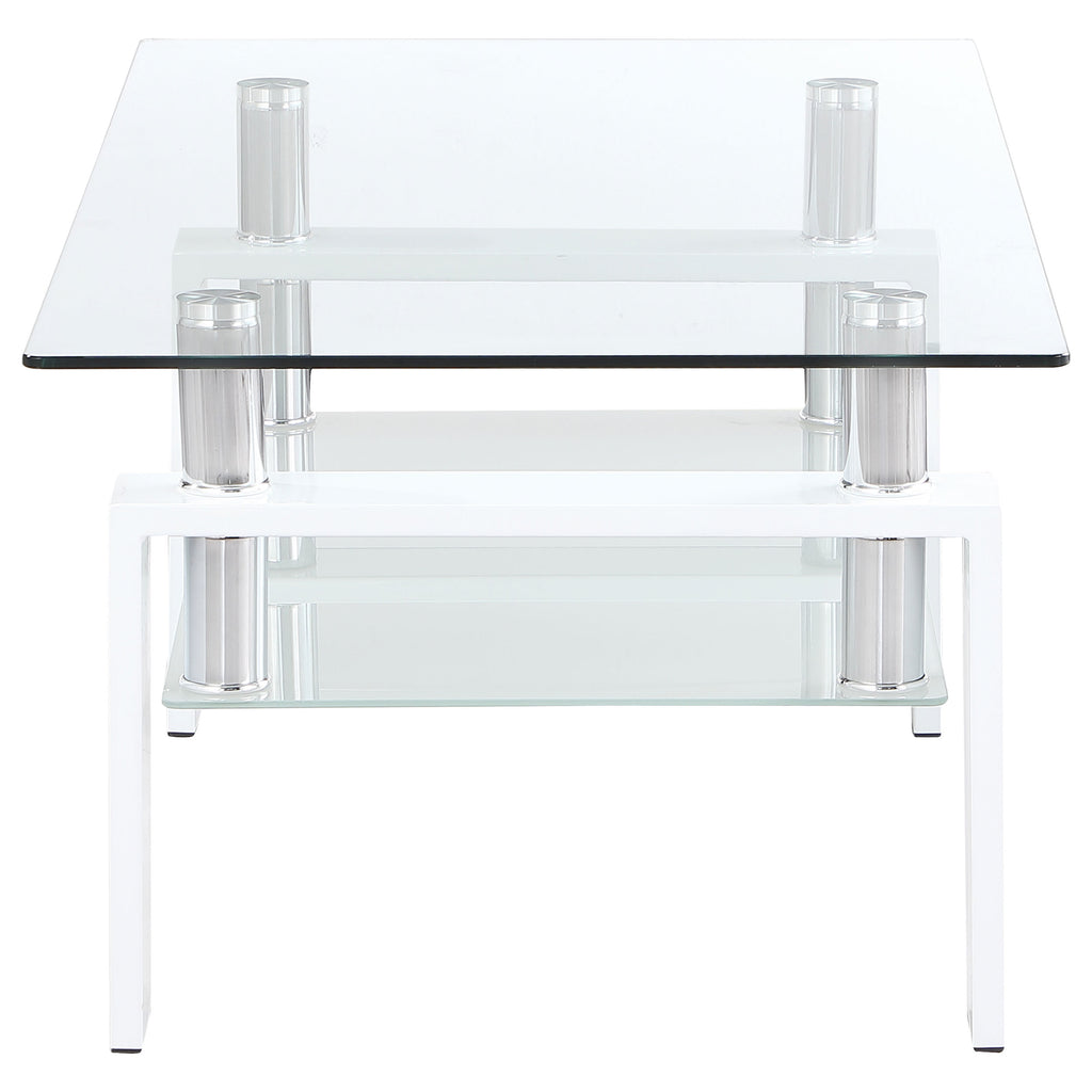 This modern coffee table set combines a rectangular coffee table and square end table, each featuring a clear tempered glass top and a frosted tempered glass shelf for extra storage or display. Supported by durable metal frames, the tables are finished in a durable powder coating, adding a bold or sleek look to your living space. This set provides versatile functionality with its open and airy design, perfect for contemporary interiors.