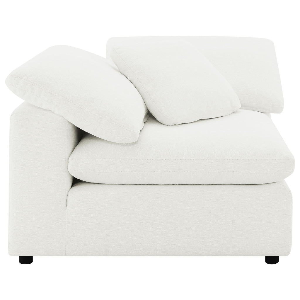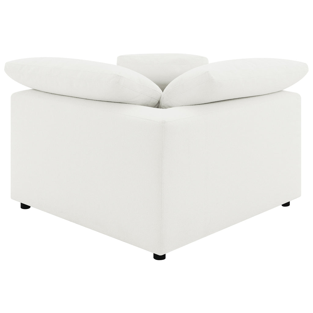Design a custom configuration for your modular sectional with a modern corner chair. This foundational piece features neutral water-resistant boucle upholstery for an on-trend look and feel that works in a variety of homes and living spaces. The corner chair connects with armless chairs, creating an L-shaped bend or ending a straight section, creating a custom sectional setup in your living room. Foam cushions pair with feather blend for exceptional comfort and a plush feel you'll love when lounging. A loose pillow back with two full-sized pillows and an accent pillow completes the look.