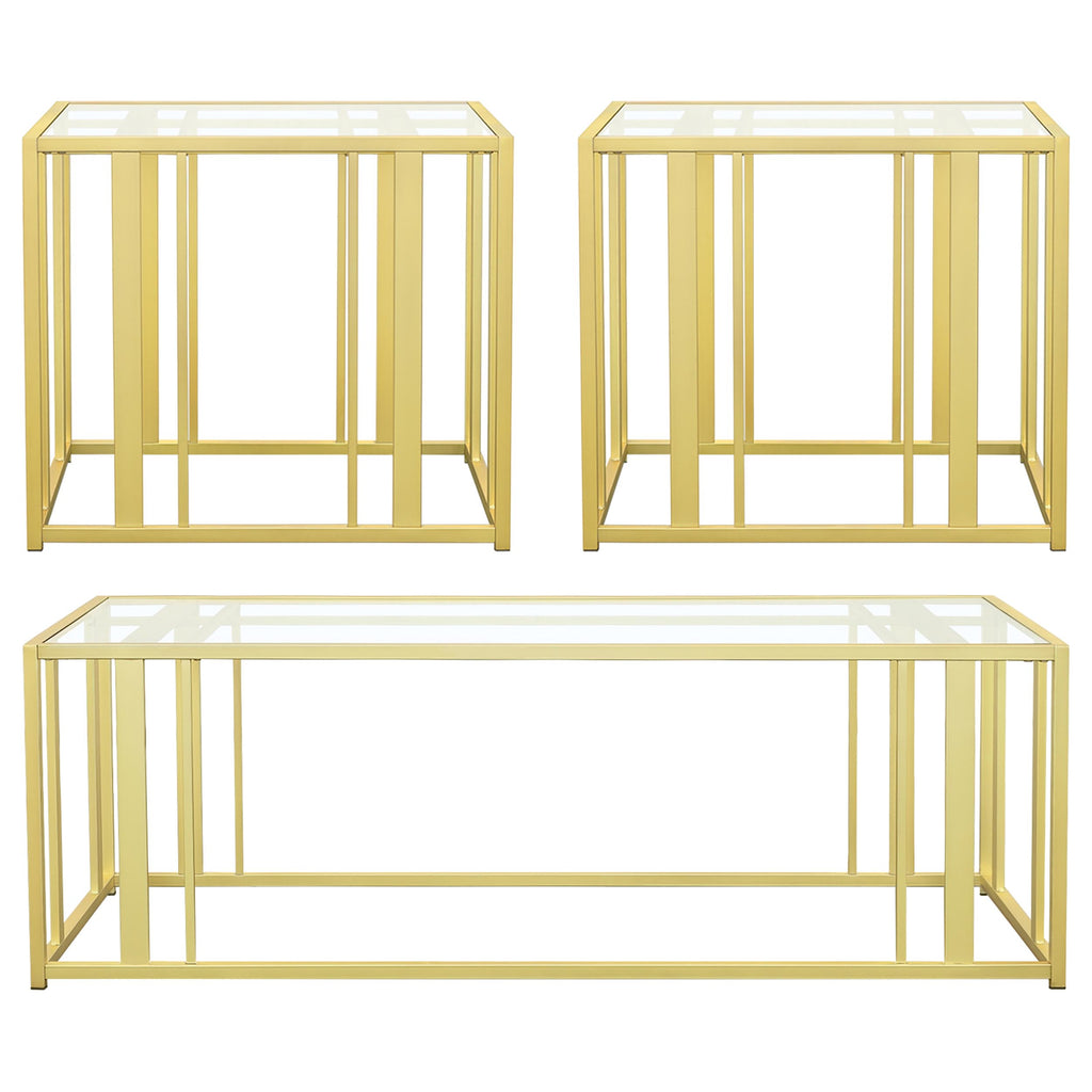 This coffee table set includes a rectangular coffee table and a matching end table, both featuring tempered glass tops and geometric bases crafted from heavy-gauge metal. The open-frame design exudes modern elegance while offering durability and functionality. Scratch-resistant materials ensure lasting quality, making the set ideal for organizing essentials or displaying decor. Its cohesive design provides a sleek, contemporary look for any living room.
