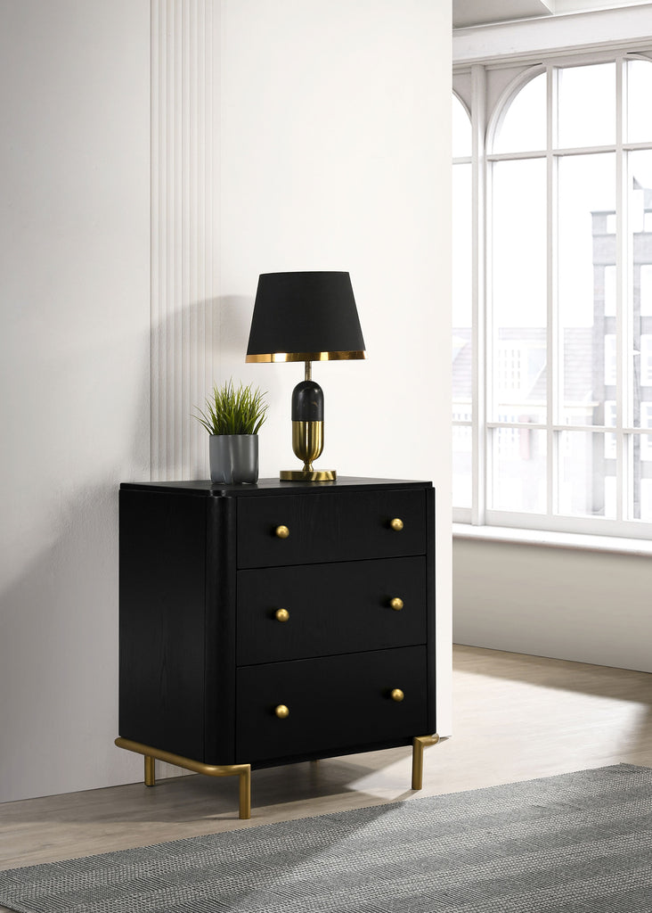 Retro charm meets modern function in this three-drawer nightstand, featuring a warm sand wash finish with subtle wire-brushed texture. Round aged brass knobs and matching tubular metal legs add a hint of glamour, while a built-in dual USB port offers convenient bedside charging. The top felt-lined drawer keeps delicate items safe, blending timeless mid-century aesthetics with everyday practicality for a refined and functional bedroom accent._x005F_x000D_ Key Features: • Three-drawer nightstand with soft sand wash wire-brushed finish • Aged brass knobs and metal legs enhance its mid-century appeal • Top drawer lined with felt to protect delicate items • Built-in dual USB ports for convenient bedside charging • Crafted from rubberwood, engineered wood, and ash veneer • Elegant rounded corners and tubular legs add modern balance