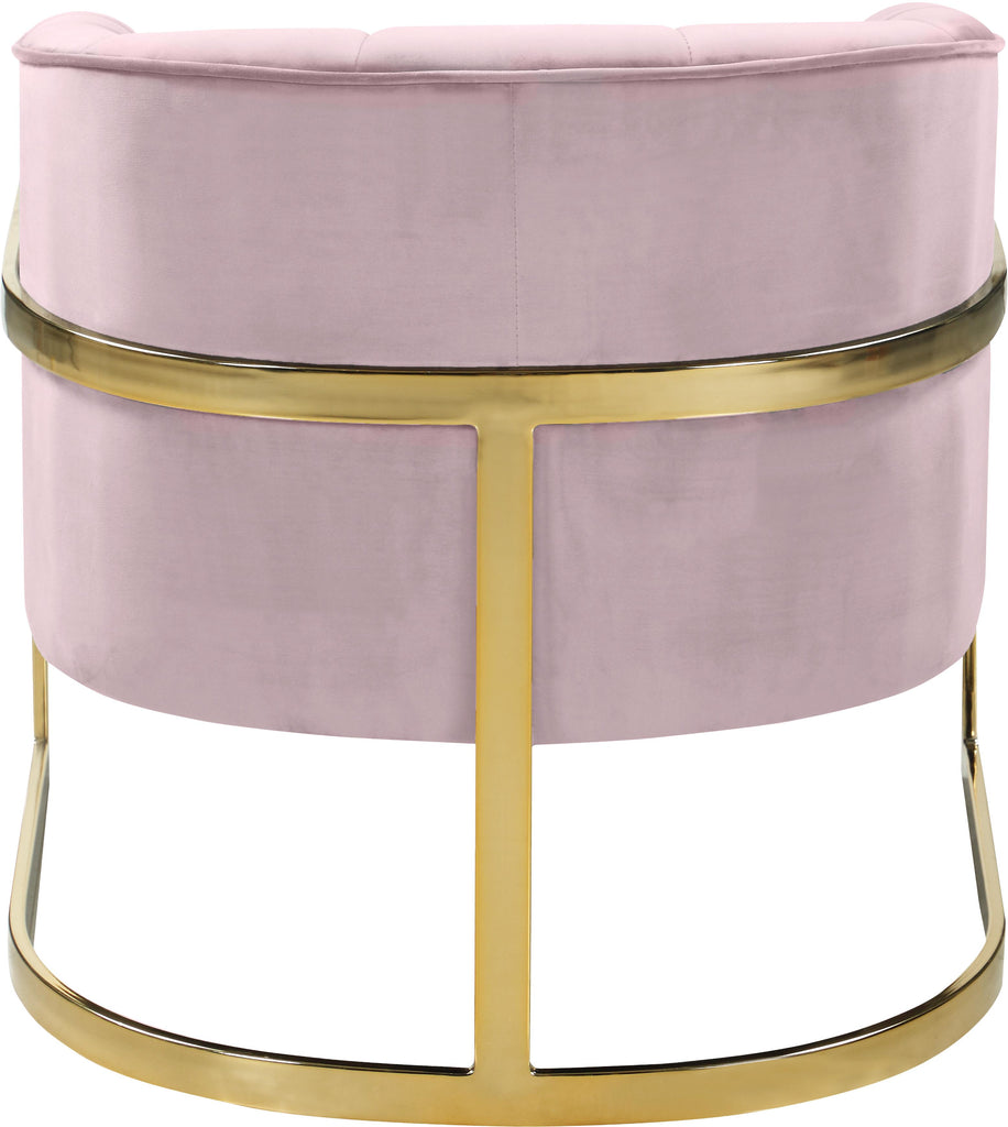 Add a touch of modern drama to your space with this Carter Pink Velvet Accent Chair from Meridian Furniture. This chair offers a super plush cushion that cradles your body in exquisite comfort as you sit, making it easily become your favorite spot in the house. Tufted channels on the arms and back add a textured feel to the chair, and it's upholstered in pink velvet, so it's soft and supple against the skin. The stainless steel base is finished in gold, adding to its elegant demeanor for your modern home.
