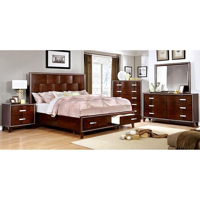 The perfect collection to declutter and organize while maintaining style. This brown cherry finished chest showcases unique geometric woodwork for a modern charm. Silver trim accents and matching silver drawer pulls add a faint glamorous touch to brighten up your room!