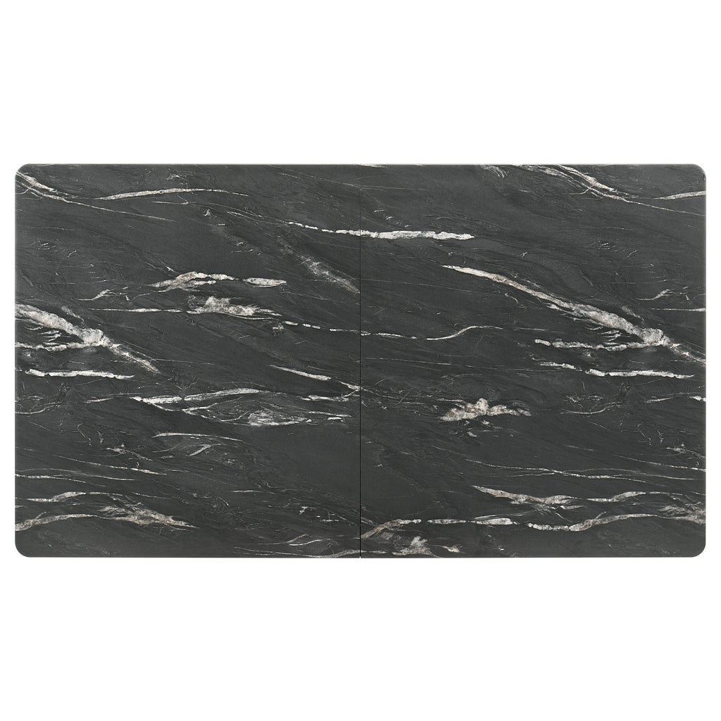 The luxurious look of faux marble creates a glam sensibility for a modern dining table. The black marble look of the tabletop complements a sleek base with fin-style legs and a recessed apron. The table includes a self-storing leaf for easy expansion to accommodate guests or the family. Its black base finish is crisp and classic, offering timeless elegance that never goes out of style. It's the perfect way to bring fresh, modern energy to your dining room. Key Features: • Stylish and chic, a modern dining table features fin-style legs for a rich look • Faux marble finish tabletop creates a sense of luxury perfect for a dedicated dining room • Black finish base and leaf create drama and depth, offering richness and character in any setting • Edge of the table is beveled to create a stylish sense of dimension and sleek style • Table includes a self-storing leaf for easy expansion to accommodate guests