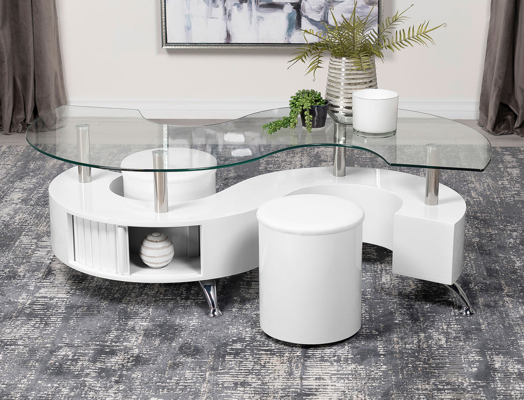 This coffee table features a serpentine shape with a clear tempered glass top and a durable engineered wood base. It includes two stools with padded seats, upholstered in faux leather for added comfort. A sliding door on both sides provides convenient storage space, while chrome accents enhance its sleek, modern design. This piece combines practicality with contemporary style, making it an ideal centerpiece for any living room. Key Features: • Curved serpentine coffee table with clear tempered glass top and chrome accents • Engineered wood construction for lasting durability and sturdy design • Two stools with faux leather upholstery and padded seats for added comfort • Sliding door opens to reveal convenient storage on both sides of the table • Chrome accents contribute to the sleek and modern aesthetic • Cappuccino wood-look finish provides a rich, sophisticated appeal