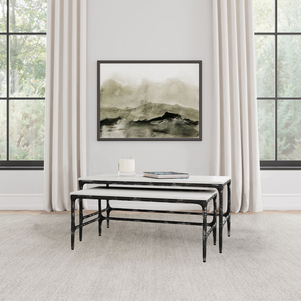 This two-piece nesting set introduces a refined center table solution. Arrange them as a cocktail table ensemble, or separate them to function as a versatile accent table. Each low table includes a genuine marble surface and an antique black iron frame, reflecting timeless sophistication. Their flexible design suits a coffee table configuration, easily adapting to changing needs. Key Features: • Sophisticated two-piece nesting coffee table set • Antique black finished iron base offers vintage charm • Genuine marble top delivers a luxurious focal point • Nesting design enables flexible, space-saving arrangements • Sturdy metal frame ensures lasting quality • Ideal for creating a stylish, multifunctional living area