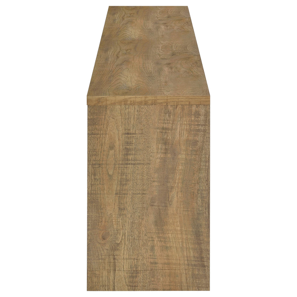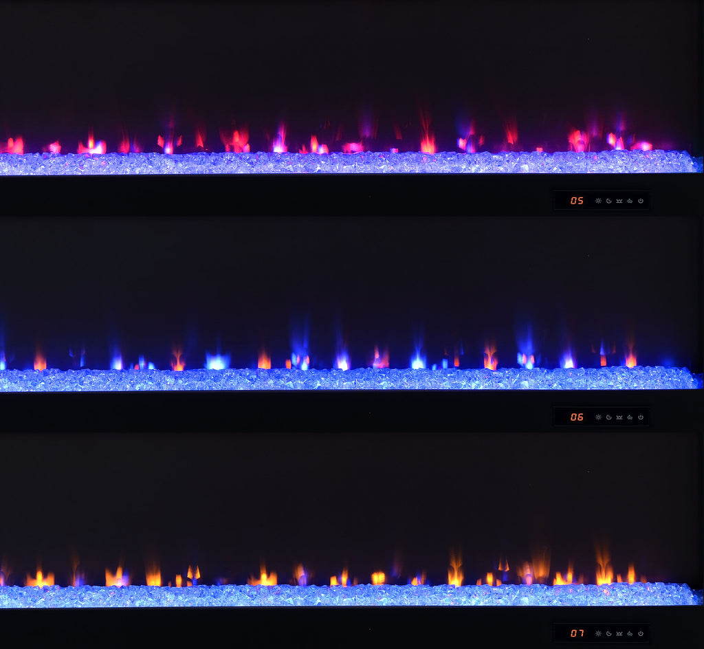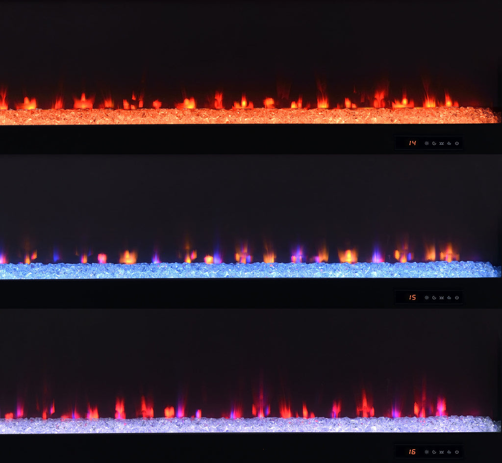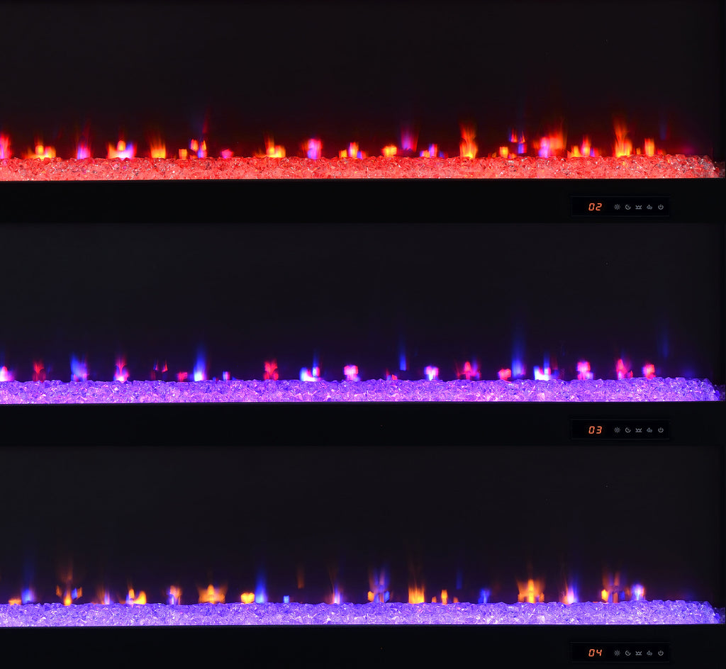 This expansive fireplace media console delivers the perfect fusion of storage and style for spacious living areas. A wide electric firebox rests atop a bed of glistening crushed acrylic crystals, offering fifteen flame color options controlled by a wireless remote. Dual open cubbies provide easy access to devices, while two cabinet doors conceal adjustable shelves for flexible storage. Crafted from engineered wood with a mango-tone laminate veneer, each compartment includes rear cutouts for wire management. Please note that this console does not include a heat function. Key Features: • TV stand flame visualizer console with crushed acrylic crystals and fifteen flame color options • Mango finish showcases natural wood grain with a rustic and warm visual texture • Two cabinet doors conceal adjustable shelves for hidden and customizable storage • Dual open cubbies offer easy access to gaming systems, players, or media devices • Crafted from engineered wood with eco-friendly, scratch-resistant laminate veneer • Accommodates TVs up to eighty-five inches with wireless remote and rear cord cutouts
