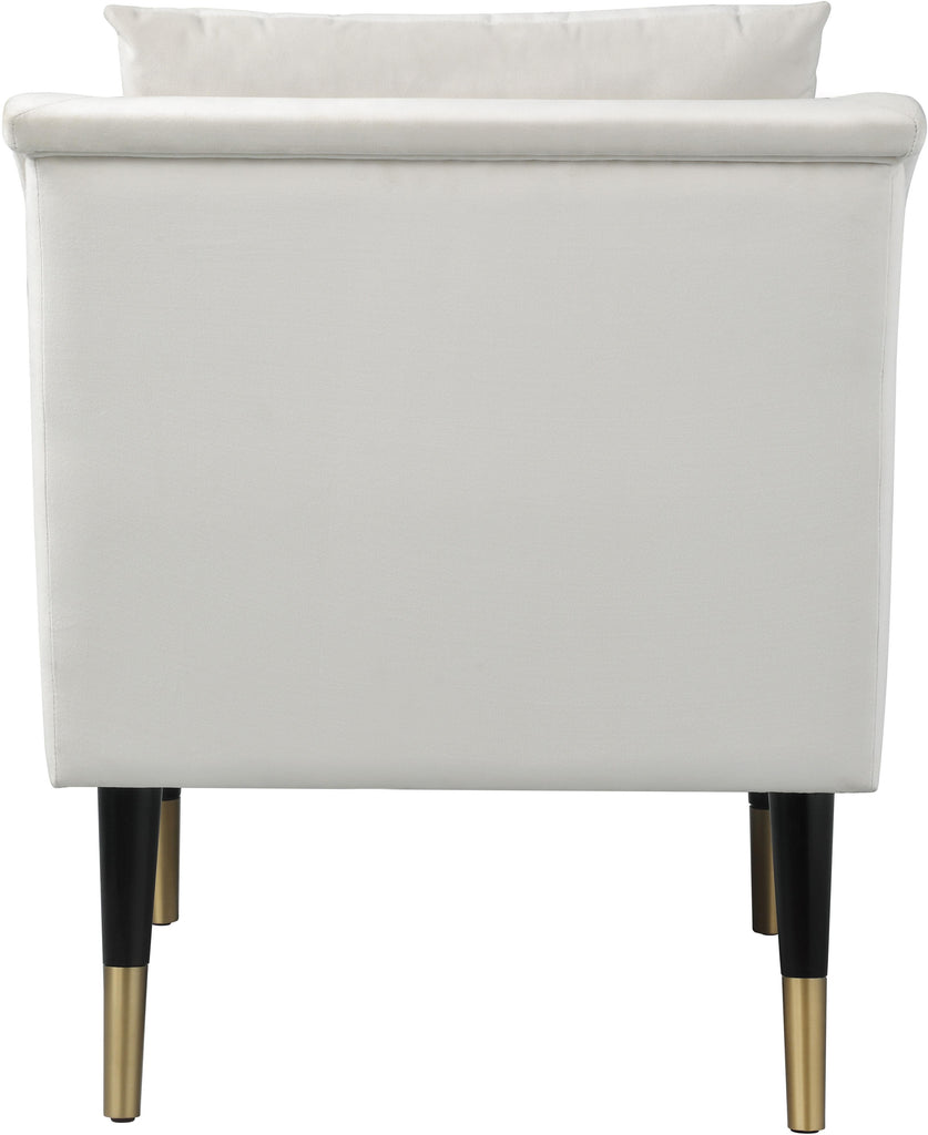Personify elegance in your living area, den or great room with this Elegante velvet chair. The chic, sleek cream velvet upholstery covering this chair is uber soft and comfortable, ensuring that it feels great against your skin. Wooden legs provide sturdy support and are painted black and topped with gold caps for a svelte finish to this exceptionally contemporary chair.
