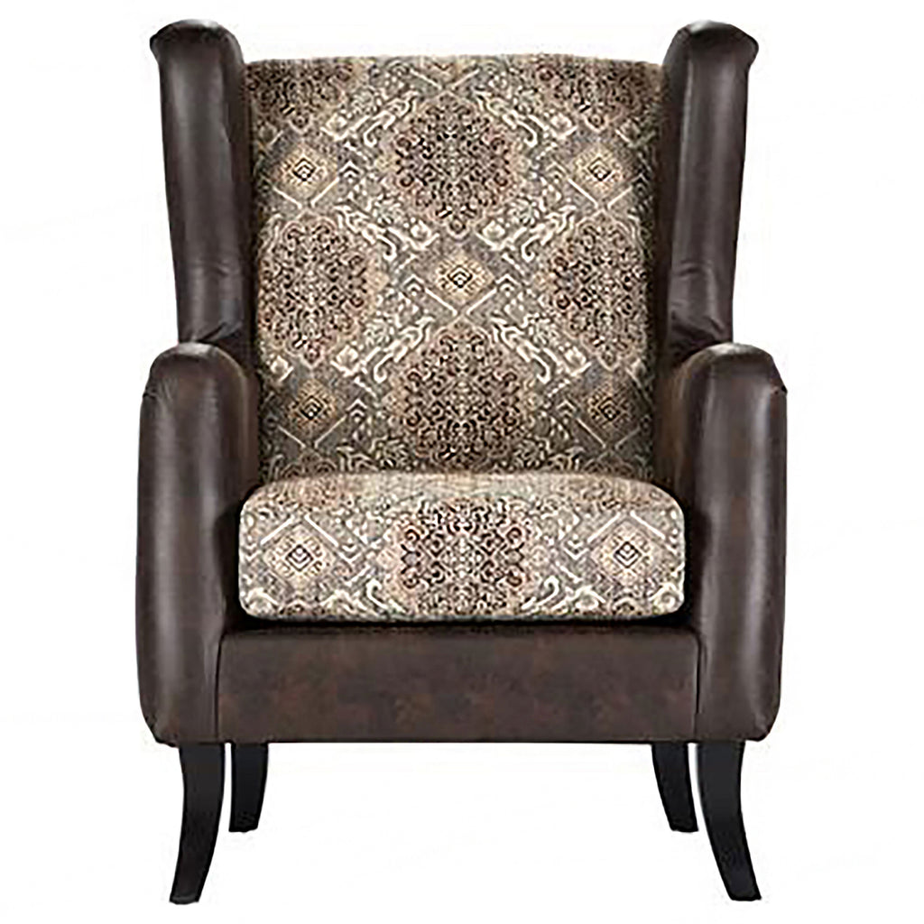 Play up the traditional ambiance of your living room or den with a timeless wingback accent armchair. Perfect for lounging, it boasts plush foam cushions with two-tone upholstery that creates a sense of depth and dimension. The sides, arms, and outer surface of the chair feature dark brown faux leather upholstery, offering sleek, refined ambiance. The seat and back cushions are a lovely brown-toned jacquard patterned upholstery that adds richness and dimensionality you'll love in your living room. Gently flared legs complete the look with a dark brown finish that offers matching flair. Key Features: • A dramatic wingback profile highlights a traditional accent armchair for a crisp, inviting look • Two-tone design features outer upholstery in brown faux leather that's smooth and sleek • Seat and back cushions features patterned brown jacquard upholstery that adds depth and contrast • Features plush cushioning with 2. 0 density foam for optimal support and comfort • Back cushion is attached while the seat cushion is reversible for added versatility