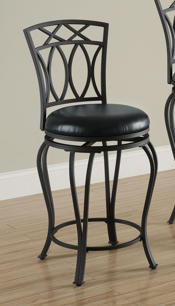 Casual, transitional style highlights this metal swivel counter stool. Perfect for an inviting kitchen island, the stool boasts a rich black finish. Coordinating black faux leather maintains a rich appearance while offering a surface that's easy to wipe clean. A decorative back features X accents over curved embellishments. Complete with a built-in footrest for added comfort and support. Key Features: • Rich black finish and coordinating black faux leather create a captivating look for any kitchen island • Decorative back with X accents and curved embellishments add a stylish touch • Built-in footrest provides extra comfort and support • Easy-to-clean faux leather surface ensures lasting beauty • Swivel design allows for easy movement and conversation