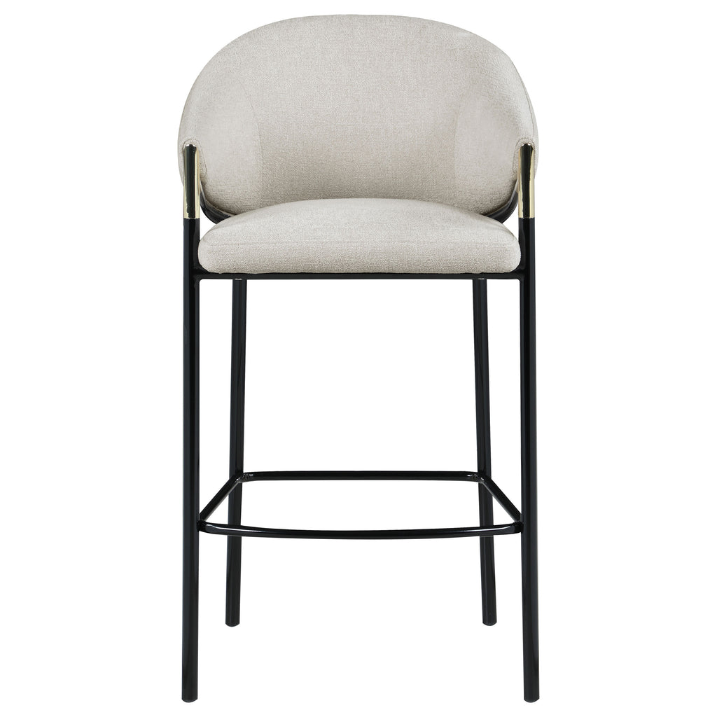 This pair of two stools offer a Hollywood regency look. With a tall and sleek design, the legs come in a glossy black finish that lends to many color palettes and offers a handsome look. Each stool has a cushioned seat, wrapped in a linen-like fabric that is soft to the touch. Plus, lean back and relax between sloped arm rests and a curved high back as you sip cocktails and chat with guests. Capping each arm rest is a gold accented piece that adds a glamorous touch. Key Features: • Tall and sleek design with glossy black finish for versatile color palettes and handsome look • Cushioned seat wrapped in linen-like fabric for soft touch and comfort; sloped arm rests and curved high back for relaxation • Gold accented pieces on arm rests for glamorous touch • Hollywood regency look perfect for sipping cocktails and chatting with guests • Sturdy construction for long-lasting use