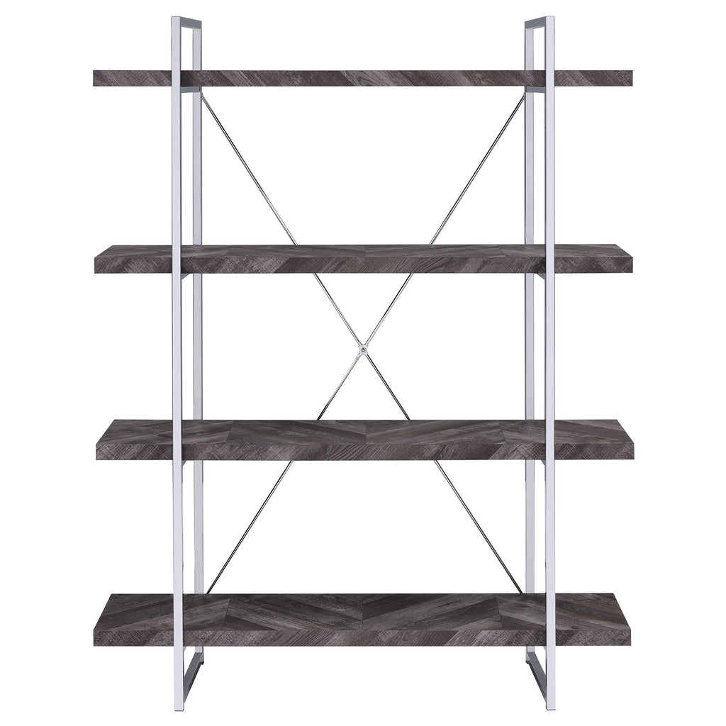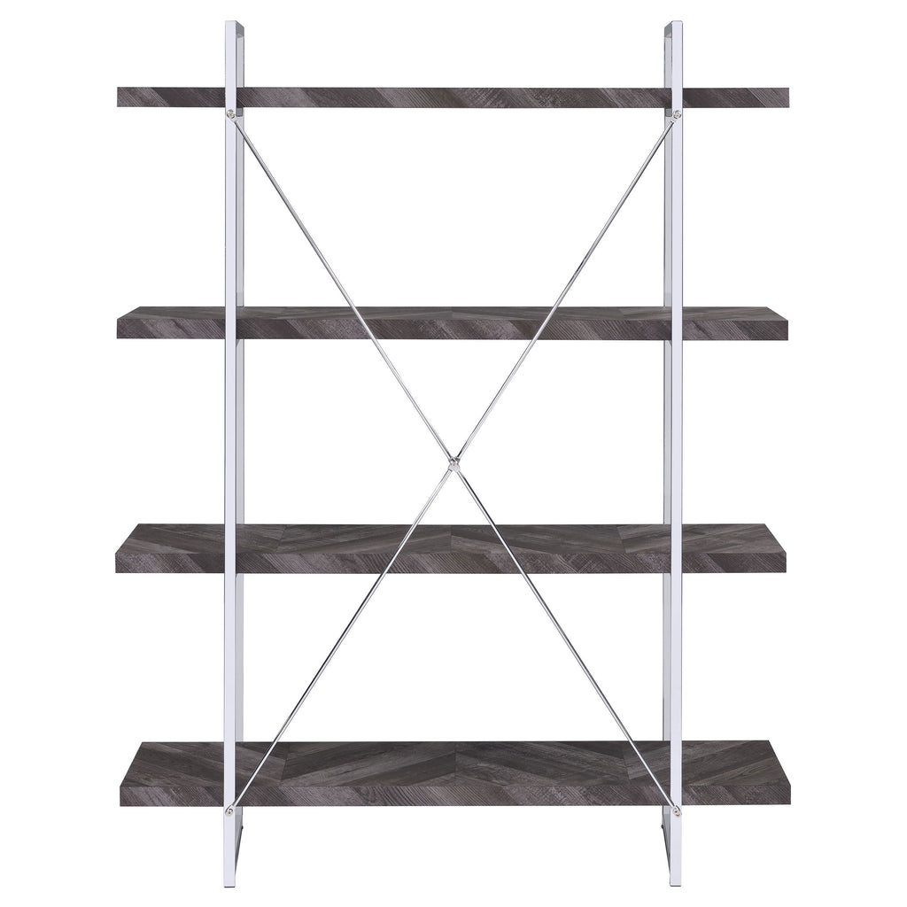 Enhance your storage and display space with this contemporary bookshelf, featuring a rustic grey herringbone finish for a modern organic touch. The sleek chrome metal frame provides durability and style, complemented by an X-shaped back support for stability. Four open shelves extend beyond the frame, creating a bold, geometric aesthetic perfect for showcasing books, décor, or collectibles. Crafted from engineered wood and metal, this shelving unit blends industrial and modern styles seamlessly, making it a stunning addition to living rooms, offices, or bedrooms. Key Features: • Four-tier bookshelf with a bold open-shelf design for a modern look • Rustic grey herringbone finish adds warmth and organic charm • Sleek chrome metal frame with X-back support enhances durability • Extended open shelves provide ample display space for books and décor • Crafted from engineered wood, MDF, and metal for long-lasting use • Ideal for home offices, living rooms, or contemporary spaces