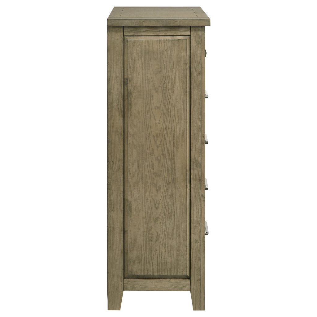 Designed with a relaxed sensibility, this five-drawer chest of drawers blends classic structure with subtle rustic appeal. Its vineyard oak finish highlights the oak grain embossing across solid rubberwood and engineered veneer surfaces. Antique nickel metal knob and pull handles add a touch of industrial charm, while heavy-duty metal ball bearing extension slides ensure smooth, dependable drawer operation. A balanced blend of softness and strength for modern bedroom storage. Key Features: • Five-drawer chest of drawers with clean lines and softly textured oak grain finish • Crafted from solid rubberwood with engineered wood veneer for durability • Vineyard oak finish enhances the natural depth of embossed wood grain • Antique nickel hardware includes a mix of metal knob and pull handles for added contrast • Heavy-duty metal ball bearing extension slides ensure smooth and reliable drawer movement • Fully assembled and includes tip-over restraint for enhanced safety