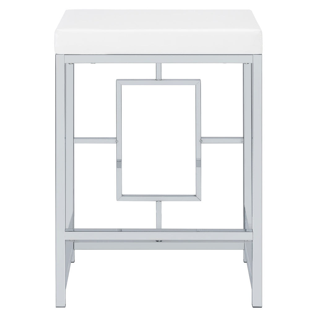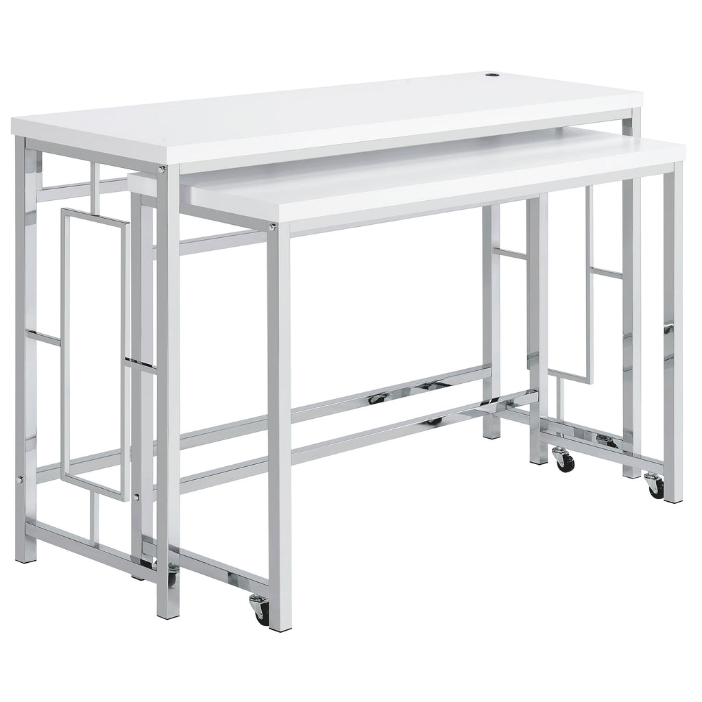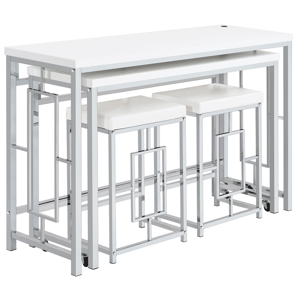 You'll fall in love with the versatility and impeccable styling of a contemporary four-piece counter height dining table set that includes two nesting tables and two backless stools. Whether you're dining or working from home, the set is designed to impress, with a larger table and a smaller table on wheels that tucks underneath, creates a waterfall effect, or can be positioned in an L-shape for working from home. Its crisp white and silver finish combination highlights artistic design. The set is complete with open sides and stool bases accentuated with floating frames to bring Deco character. The large tabletop is equipped with a USB port perfect for your phone. Key Features: • A modern four-piece dining set with two tables and two stools is perfect for multi-functional spaces • Silver metal finish perfectly complemented with white tabletops and faux leather for a crisp look • Set features floating rectangular frame design that lends Art Deco flair to contemporary design • Two stools are backless, with silver finish bases and faux leather upholstery over foam padding • Smaller table is on wheels and nests under the larger, which includes a USB port in the tabletop
