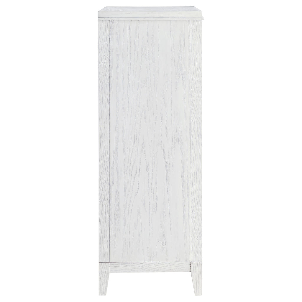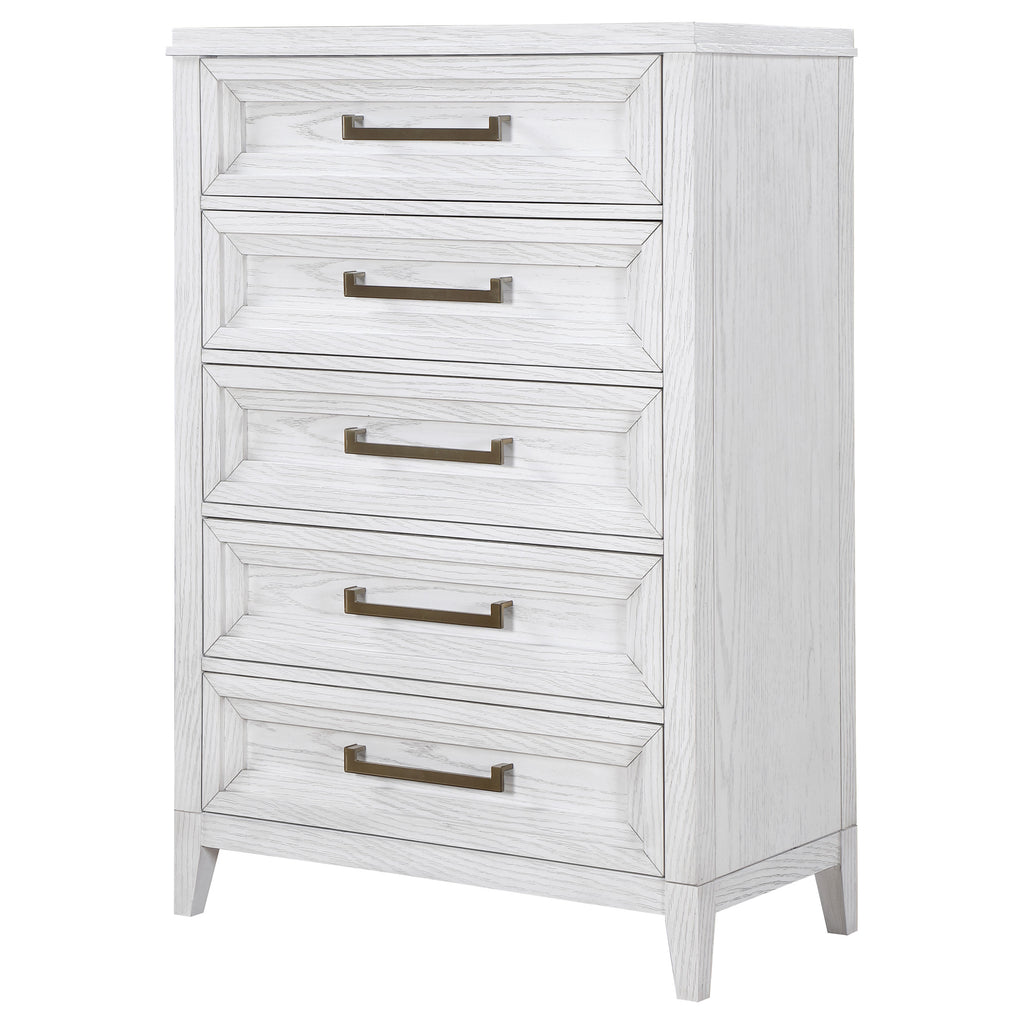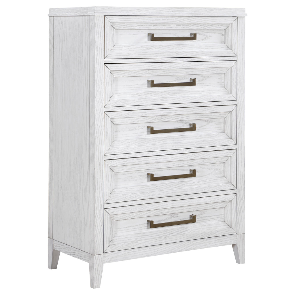 Add easy storage and inviting style to your bedroom with a modern five-drawer chest. It's tall, compact silhouette conserves space while adding welcome storage and organization. The chest features a distressed white finish to highlight wood grain details for a fresh, organic effect in your bedroom. Antique brass-toned bar pulls add contrast and definition on trimmed drawer fronts, creating inviting texture and depth. Tapered legs finish off this inviting look and a tip over restraint is included for added safety.