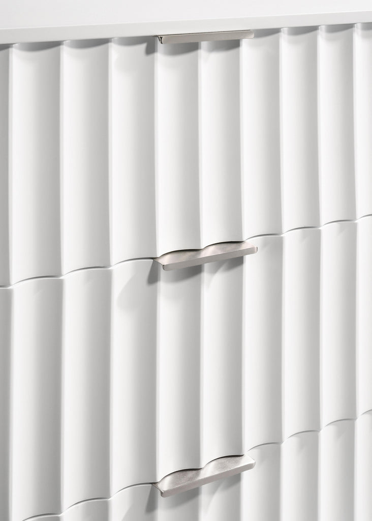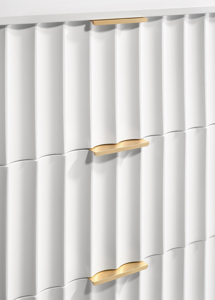 Embody industrialist style with this Modernist chest in a white medium gloss finish. Utilitarian but sculptural in design, this piece features a ridged, textured look that is chic but sleek. It rests on brushed gold steel legs and has gold brushed handles for a bit of regality. Combine this piece with other items in the Modernist lineup for a cohesive finish to your room makeover.