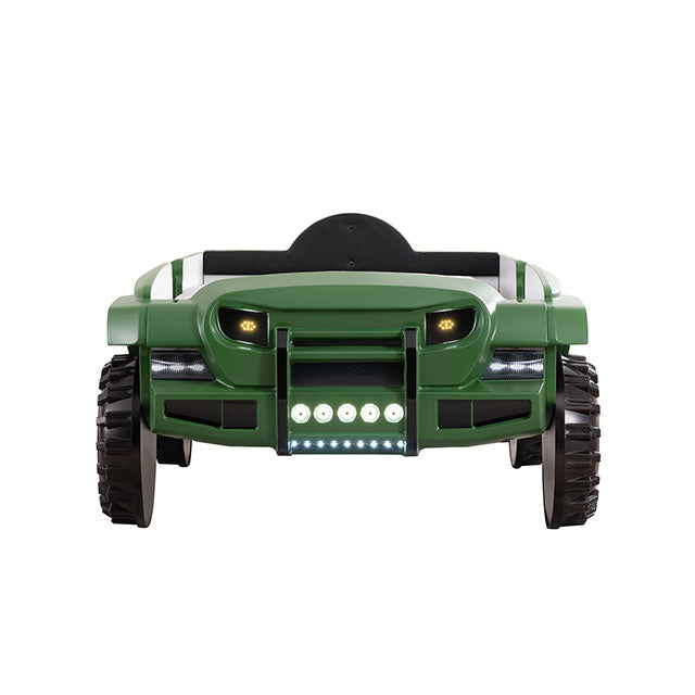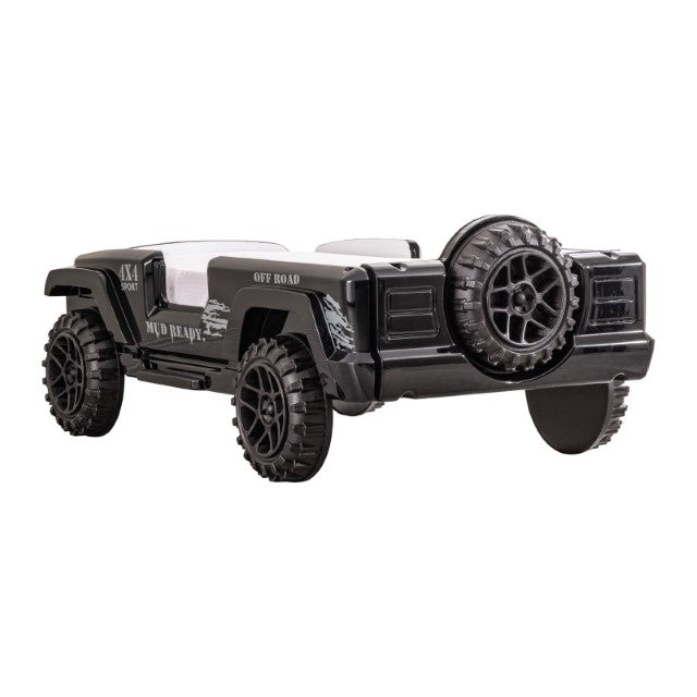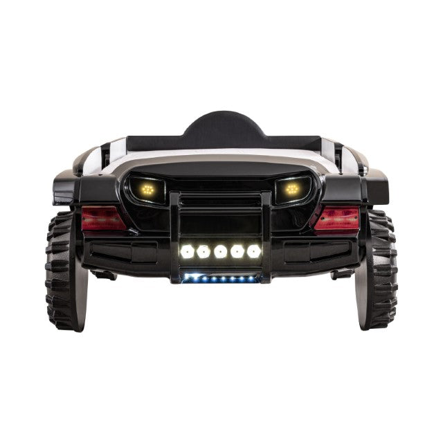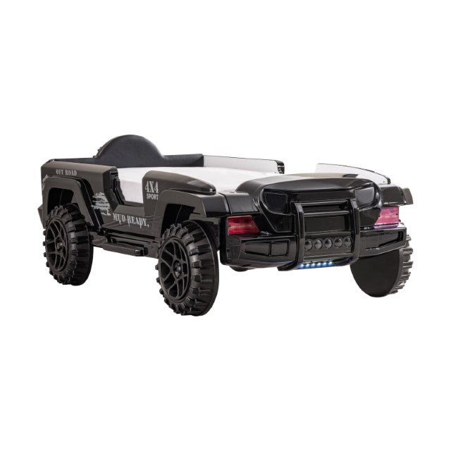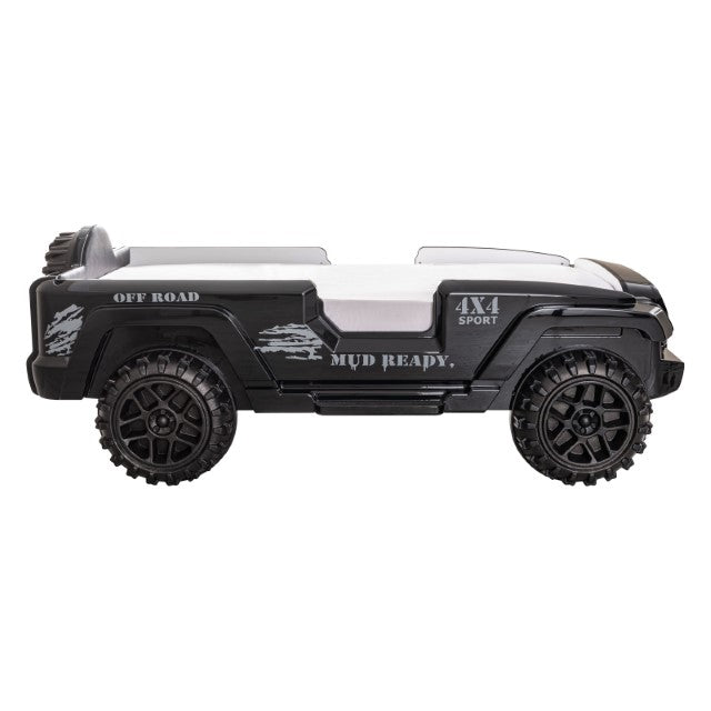 Turn your kids' nighttime routine upside down in a good way with this fun and novel bed! They will love this off-road SUV bed, with awesome features such as bright, remote-controlled lights that glow to the tune of the built-in speakers. The padded leatherette headboard offers safety and comfort, while large replicated tires help fuel their imagination of adventures each and every night.