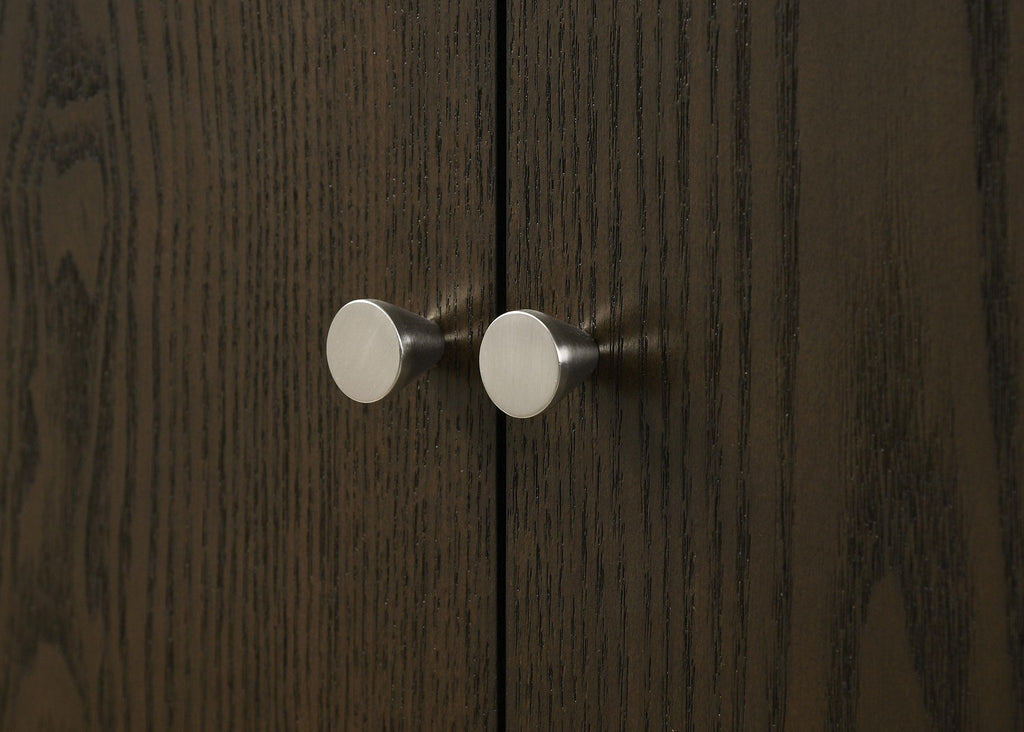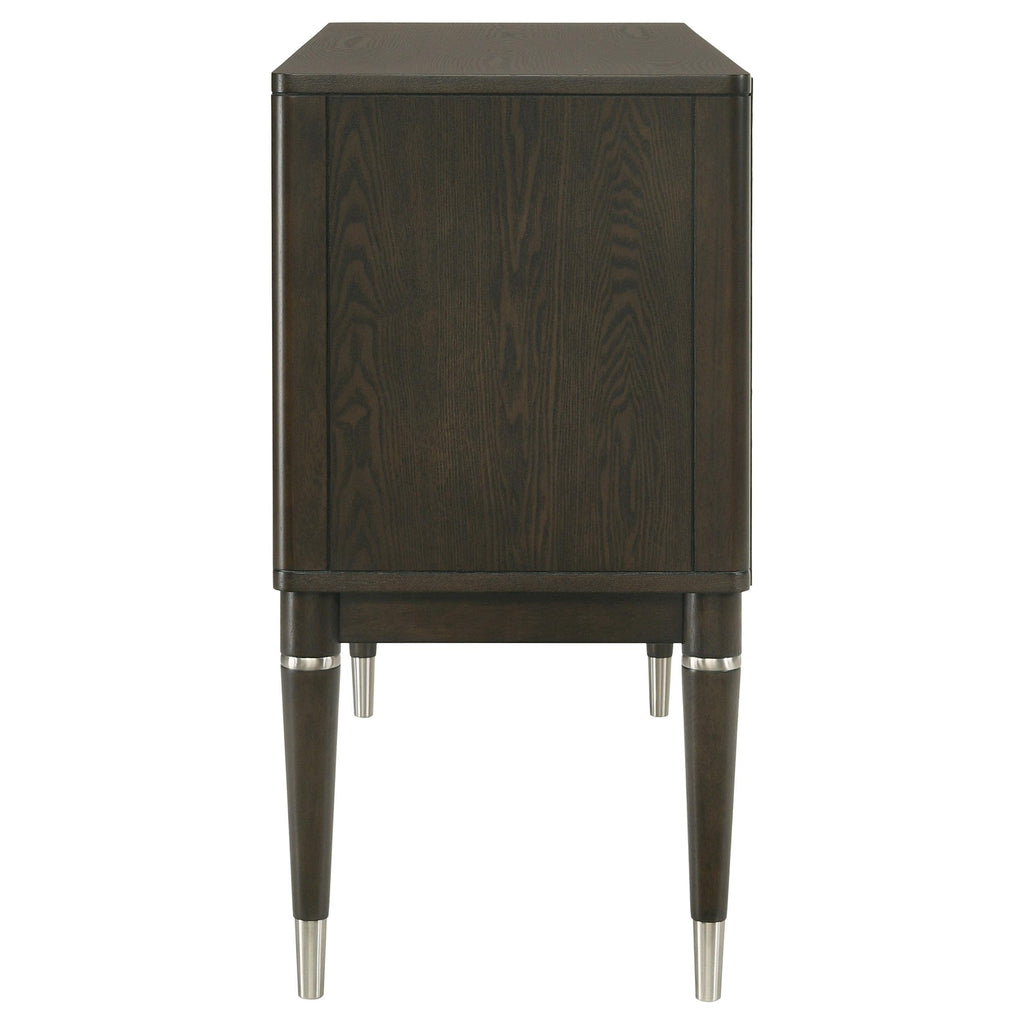Add both style and functionality to your dining room with this elegant sideboard, finished in a sophisticated ash brown wood tone. The clean-lined design features four cabinet doors that open to reveal spacious shelving, perfect for storing tableware, linens, or other essentials. Crafted from engineered wood, rubberwood, and ash veneer, it ensures long-lasting durability. Sleek metal-capped tapered legs and minimalist hardware accents complete the modern aesthetic, making this sideboard a refined and practical choice for your dining area. Key Features: • Stylish sideboard with a sleek ash brown wood finish • Features four cabinet doors with spacious interior shelving • Constructed from engineered wood, rubberwood, and ash veneer • Tapered legs with metallic caps for a modern design • Compact yet functional for organized tableware storage • Minimalist hardware adds a contemporary touch