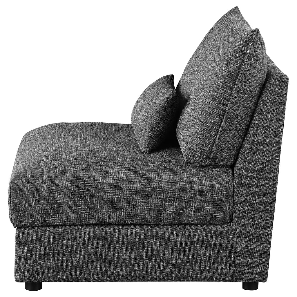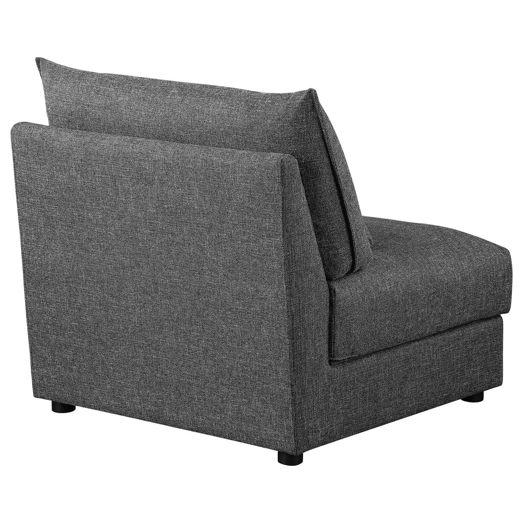 Complete your living space with the refined look and elegant simplicity of a modern modular armless chair. Alone or in a larger configuration, it features plush feather blend and foam cushions with slightly textured upholstery for a sleek look and feel. The slipper-style chair is armless, great for a small space or adding length to a sofa. Barely black upholstery creates a sense of texture and depth while maintaining a neutral look for your living room. A lumbar pillow is included for added comfort and support. Key Features: • A modular armless chair is beautiful alone or as part of a larger seating configuration • Slipper chair inspired silhouette lends clean, refined style in any sitting area • Modern barely black upholstery offers refined, neutral style • Smooth cushions feature foam padding, and a lumbar pillow is included for added comfort • Round legs are compact and understated, providing support and offering a clean, refined look
