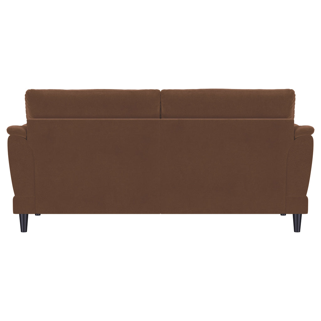 Unwind in style with this chic retro-inspired sofa, designed to deliver both comfort and timeless elegance. Upholstered in a rust woven fabric, it features plush foam seat cushions and curved tufted arms for ultimate support. The fully encased engineered wood frame ensures lasting stability, while sinuous spring seating offers durable comfort. Solid wood legs in an espresso finish complete the sturdy construction, adding a sleek modern touch to this versatile seating option. Key Features: • Retro-inspired sofa with curved tufted arms • Rust woven fabric upholstery for a cozy, chic look • Fully encased engineered wood frame for durability • Sinuous spring seating and foam cushion construction • Attached seat cushions and removable back cushions • Solid wood tapered legs in espresso finish