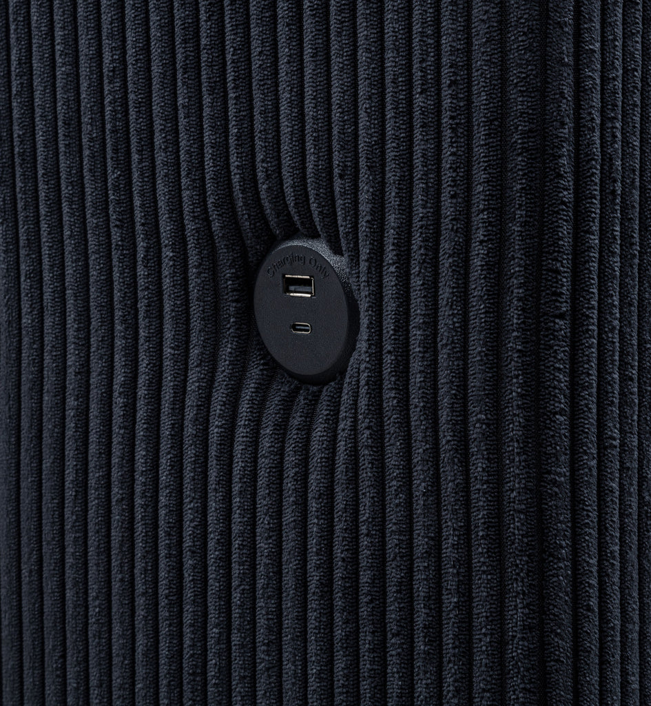 This innovative wingback bed levels up a top-selling design with bold tech upgrades and plush texture. A hidden motorized TV mount rises from the footboard via remote control, supporting screens up to 50 inches and tucking neatly away when not in use. The headboard’s flame visualizer glows over shimmering crystal rocks with sixteen color settings. Dual USB-A and USB-C ports on each side keep devices powered. Upholstered in soft, faux fur-style corduroy over a solid pine frame. Key Features: • Queen wingback bed upgraded with motorized TV lift in footboard and remote-controlled flame box • Plush black faux fur-like corduroy fabric delivers striking, tactile softness and bold style • Hidden footboard TV rack accommodates up to fifty-inch flat screens with smooth lift • Headboard includes crystal flame visualizer with sixteen color options and no heat output • Dual USB-A and USB-C ports on each side of headboard provide fast, convenient charging • Solid pine frame and seven-foot electrical cord ensure reliable structure and easy power access
