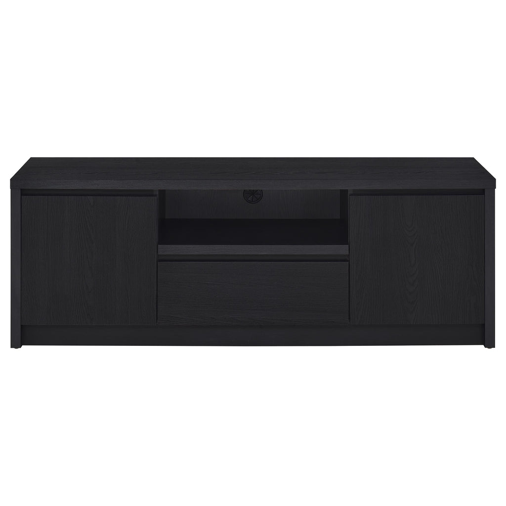This modern entertainment center combines a sleek TV stand with two matching media towers, offering style and functionality. Finished in a bold black with a scratch-resistant eco-friendly laminate veneer, this unit provides ample storage and display options. The TV stand features cabinets, an open shelf with cable management, and a wide drawer, while each media tower includes open shelves and a bottom cabinet for organized storage. Perfect for creating a cohesive entertainment space in any living room.