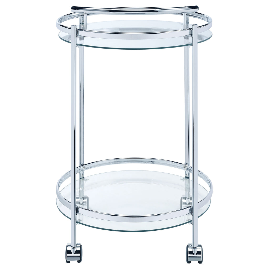 Perfect for entertaining, this modern, rolling bar cart glides from one space to the next. Caster wheels at the bottom even lock in place, creating extra stability as you pour a glass for guests. The slim, round, metal frame makes it a breeze to tuck the cart into corners to create an instant bar station and home bar in tight rooms. Elevating the overall look is a luxe metallic finish that gives off a modern glam aesthetic. Between the gleaming metal frame are tempered glass shelves, allowing light to shine through for a loftier look and feel. Key Features: • Captivating electroplated round bar cart with a harmonious fusion of design and practicality • Constructed from high-quality metal for durability • Two levels of exquisite clear tempered glass shelving offer generous storage space • Equipped with lockable caster wheels for seamless mobility and stability • Elevate your entertaining experience with this versatile and elegant bar cart, perfect for contemporary settings