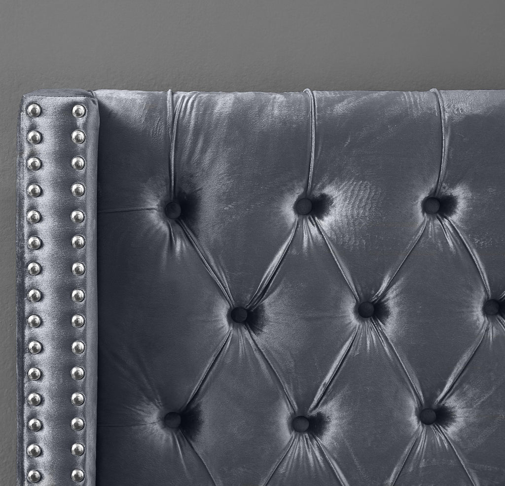 Elegant and eye-catching, the stunning Aiden Bed from Meridian Furniture is the perfect addition to any bedroom. Rich velvet covers the deep tufted design. A beautiful wing bed design is complimented by hand applied chrome nail head details. Strength and beauty is guaranteed with a solid wood frame and stainless steel legs.