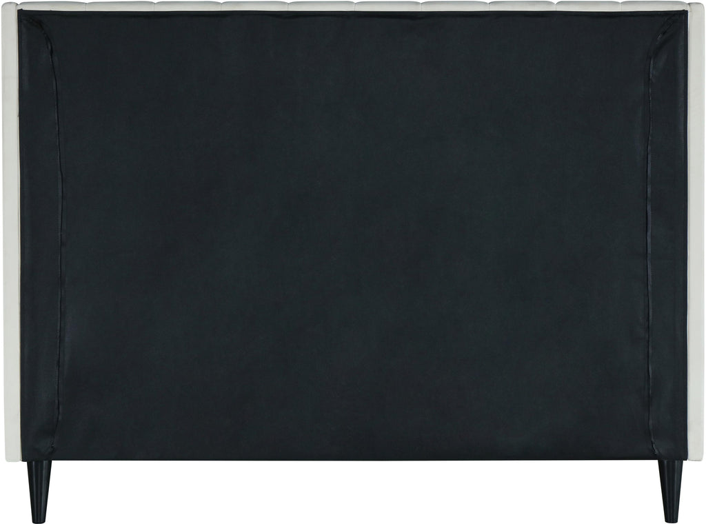 Snuggle up to a pet or other loved one in this richly upholstered Eva cream velvet full size bed for the ultimate in rest and relaxation. The wing back headboard has cushioned vertical deep channel tufting, and both the side rails and footboard are upholstered too for your comfort. Tapered black wood legs match the upholstery and support this contemporary bed, elevating it sufficiently that you can store items underneath.