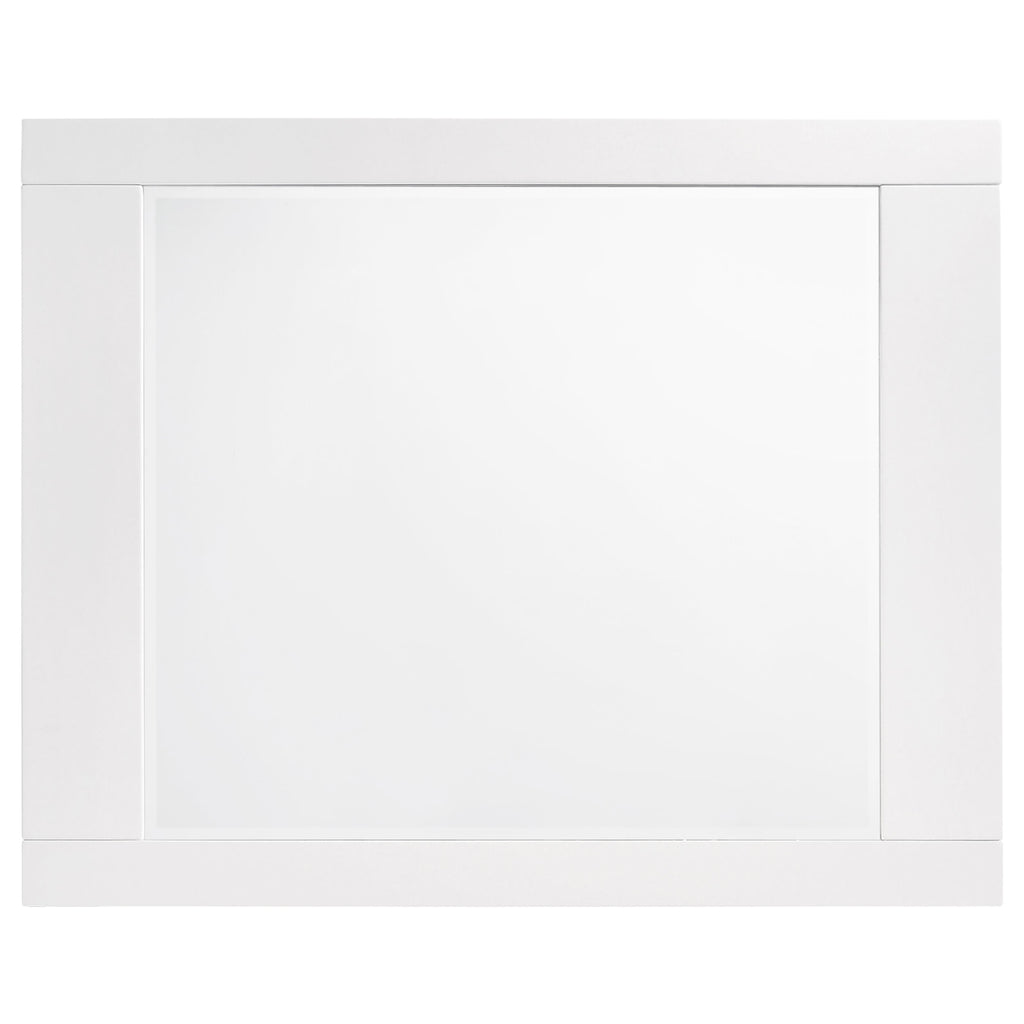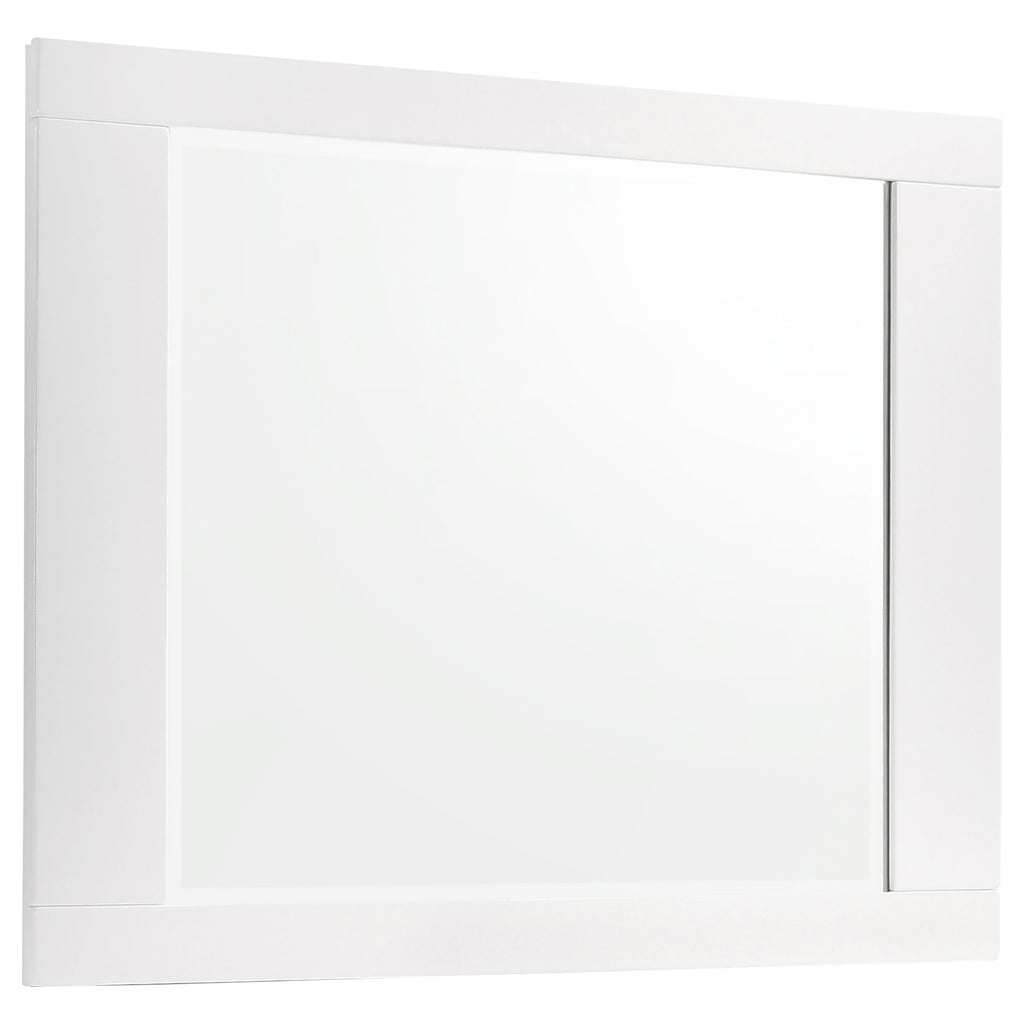 Sleek and contemporary, this four-piece bedroom set exudes modern glamour. Its white, polyurethane coating is pleasingly polished to a gorgeous, glossy finish. The mirror and case pieces are simple and straight. The sturdy bed frame boasts a boldly curved shape. Gleaming, chrome hardware completes its design with even more brilliant shine. Key Features: • Stellar contemporary design shows off clean lines and a cool, airy design aesthetic • Designer white polyurethane finish polished to a superior high-gloss effect • Bed features plank headboard and low profile footboard • Polished chrome metal bar pull handles add minimalist appeal • Spacious storage drawers with felt-lining in top drawers • Metal extension glides create stability and smooth operation