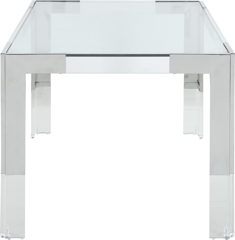 Enjoy intimate meals with those you love when you gather around this Casper dining table. This beautifully eye-catching table features a rich chrome frame topped with a clear glass top for a rich, luxe look. Acrylic legs crown the stainless steel frame, adding to its contemporary feel. Pair it with your favorite modern chairs for an instant dining room or breakfast nook facelift.